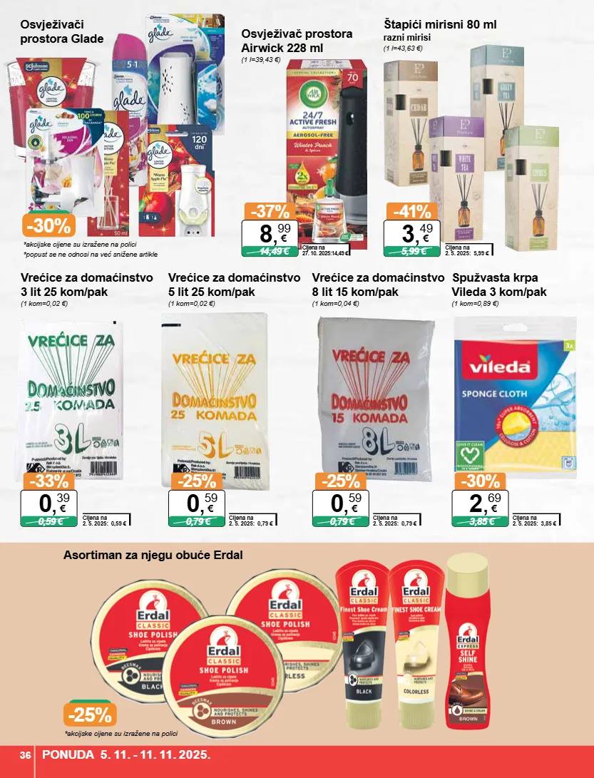 *akcijske cijene su izražene na polici  -25%  *akcijske cijene su izražene na polici *popust se ne odnosi na već snižene artikle  -30%   cijena na 27. 10. 2025:14,49 € cijena na 2. 5. 2025: 5,99 € cijena na 2. 5. 2025: 0,59 € cijena na 2. 5. 2025: 0,79 € cijena na 2. 5. 2025: 0,79 € cijena na 2. 5. 2025: 3,85 €  asortiman za njegu obuće erdal osvježivači  prostora glade   osvježivač prostora  airwick 228 ml  (1 l=39,43 €)  -37%  14,49 €  8 , 99  €  štapići mirisni 80 ml razni mirisi  (1 l=43,63 €)  -41%  5,99 €  3 , 49  €  vrećice za domaćinstvo  3 lit 25 kom/pak  (1 kom=0,02 €)  -33%  0,59 €  0 , 39  €  vrećice za domaćinstvo  5 lit 25 kom/pak  (1 kom=0,02 €)  -25%  0,79 €  0 , 59  €  vrećice za domaćinstvo  8 lit 15 kom/pak  (1 kom=0,04 €)  -25%  0,79 €  0 , 59  €  spužvasta krpa  vileda 3 kom/pak  (1 kom=0,89 €)  -30%  3,85 €  2 , 69  € ponuda 5. 11. - 11. 11. 2025.  36