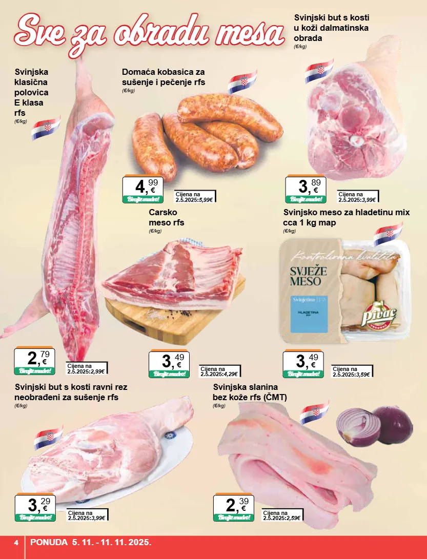 cijena na 2.5.2025: 2,99€  cijena na 2.5.2025: 3,99€  cijena na 2.5.2025: 3,99€  cijena na 2.5.2025: 5,99€  cijena na 2.5.2025: 3,59€  cijena na 2.5.2025: 2,59€  cijena na 2.5.2025: 4,29€  carsko meso rfs  (€/kg)  domaća kobasica za sušenje i pečenje rfs  (€/kg)  svinjsko meso za hladetinu mix  cca 1 kg map  (€/kg)  svinjska klasična  polovica e klasa rfs  (€/kg)  svinjski but s kosti u koži dalmatinska  obrada  (€/kg)  svinjska slanina bez kože rfs (čmt)  (€/kg)  svinjski but s kosti ravni rez neobrađeni za sušenje rfs  (€/kg)  birajte mudro!  2 , 79  €  birajte mudro!  3 , 29  €  birajte mudro!  3 , 89  €  birajte mudro!  4 , 99  €  birajte mudro!  3 , 49  €  birajte mudro!  2 , 39  €  birajte mudro!  3 , 49  € ponuda 5. 11. - 11. 11. 2025.  4  sve za obradu mesa sve za obradu mesa