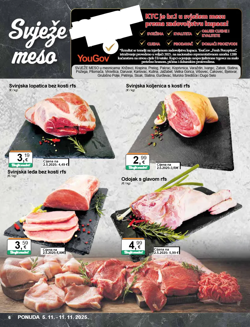 svježe meso u mesnicama: križevci, krapina, prelog, pakrac, koprivnica, varaždin, ivanec, zabok, slatina, požega, pitomača, virovitica, daruvar, karlovac, kutina, jalžabet, velika gorica, vrbovec, čakovec, bjelovar, grubišno polje, petrinja, sisak, slatina, đurđevac, mursko središće i dugo selo  ktc je br.1 u svježem mesu ktc je br.1 u svježem mesu prema zadovoljstvu kupaca! prema zadovoljstvu kupaca!  *rezultat se temelji na izjavljenom zadovoljstvu kupaca. yougov „fresh perception”, istraživanje provedeno u veljači 2025. na nacionalno reprezentativnom uzorku 1200 kućanstava na nivou cijele hrvatske. kupci ocjenjuju nespecijalizirane trgovce na malo pretežno hranom, pićima i duhanskim proizvodima.  domaći proizvodi domaći proizvodi omjer cijene i omjer cijene i kvalitete kvalitete prodavač prodavač kvaliteta kvaliteta svježina svježina cijena cijena  potvrdili kupci  cijena na 2.5.2025: 3,59€  cijena na 2.5.2025: 5,99€  cijena na 2.5.2025: 5,99   €  cijena na 2.5.2025: 4,49   €  odojak s glavom rfs  (€ / kg)  birajte mudro!  4 , 99  €  svinjska lopatica bez kosti rfs  (€ / kg)  svinjska koljenica s kosti rfs  (€ / kg)  svinjska leđa bez kosti rfs  (€ / kg)  birajte mudro!  3 , 19  €  birajte mudro!  2 , 99  €  birajte mudro!  3 , 59  € ponuda 5. 11. - 11. 11. 2025.  6  svježe meso