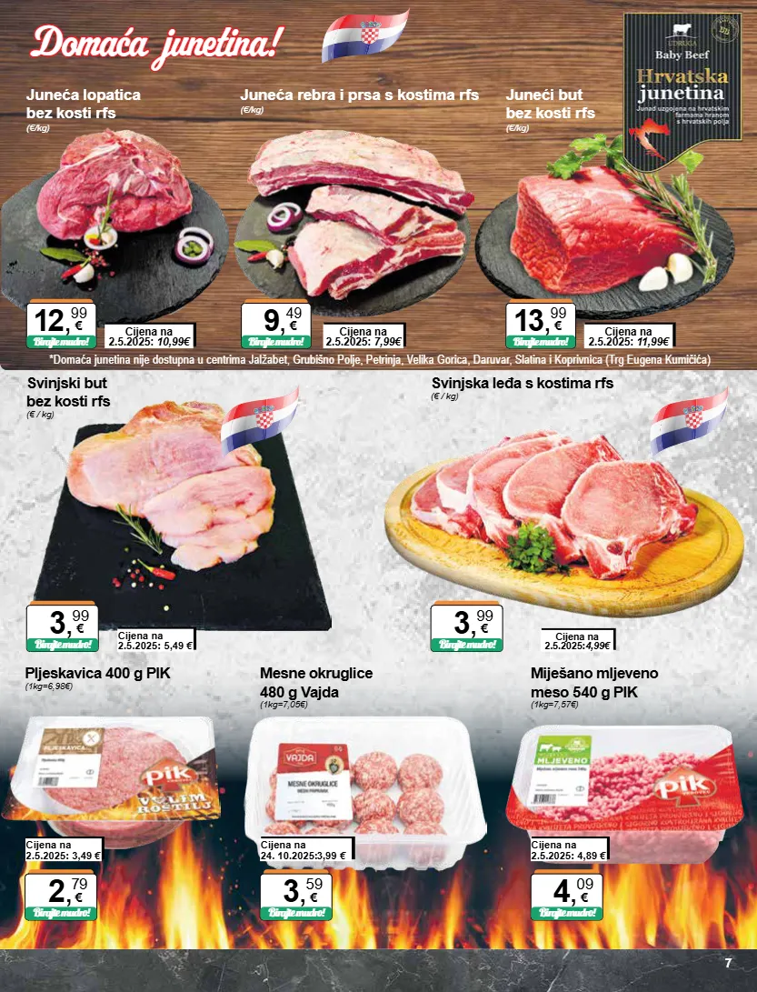 *domaća junetina nije dostupna u centrima jalžabet, grubišno polje, petrinja, velika gorica, daruvar, slatina i koprivnica (trg eugena kumičića)  cijena na 2.5.2025:   11,99€  cijena na 2.5.2025:   10,99€   cijena na 2.5.2025:   7,99€  cijena na 2.5.2025: 4,99€  cijena na 2.5.2025: 5,49   €  cijena na 2.5.2025: 4,89   €  cijena na 24. 10.2025:3,99   €  cijena na 2.5.2025: 3,49   €  svinjski but bez kosti rfs  (€ / kg)  miješano mljeveno  meso 540 g pik  (1kg=7,57€)  mesne okruglice 480 g vajda  (1kg=7,05€)  pljeskavica 400 g pik  (1kg=6,98€)  juneći but bez kosti rfs  (€/kg)  juneća lopatica bez kosti rfs  (€/kg)  juneća rebra i prsa s kostima rfs  (€/kg)  13 , 99  €  birajte mudro!  12 , 99  €  birajte mudro!  9 , 49  €  birajte mudro!  birajte mudro!  3 , 99  €  birajte mudro!  4 , 09  €  birajte mudro!  3 , 59  €  birajte mudro!  2 , 79  €  svinjska leđa s kostima rfs  (€ / kg)  birajte mudro!  3 , 99  € 7  domaća junetina! domaća junetina!