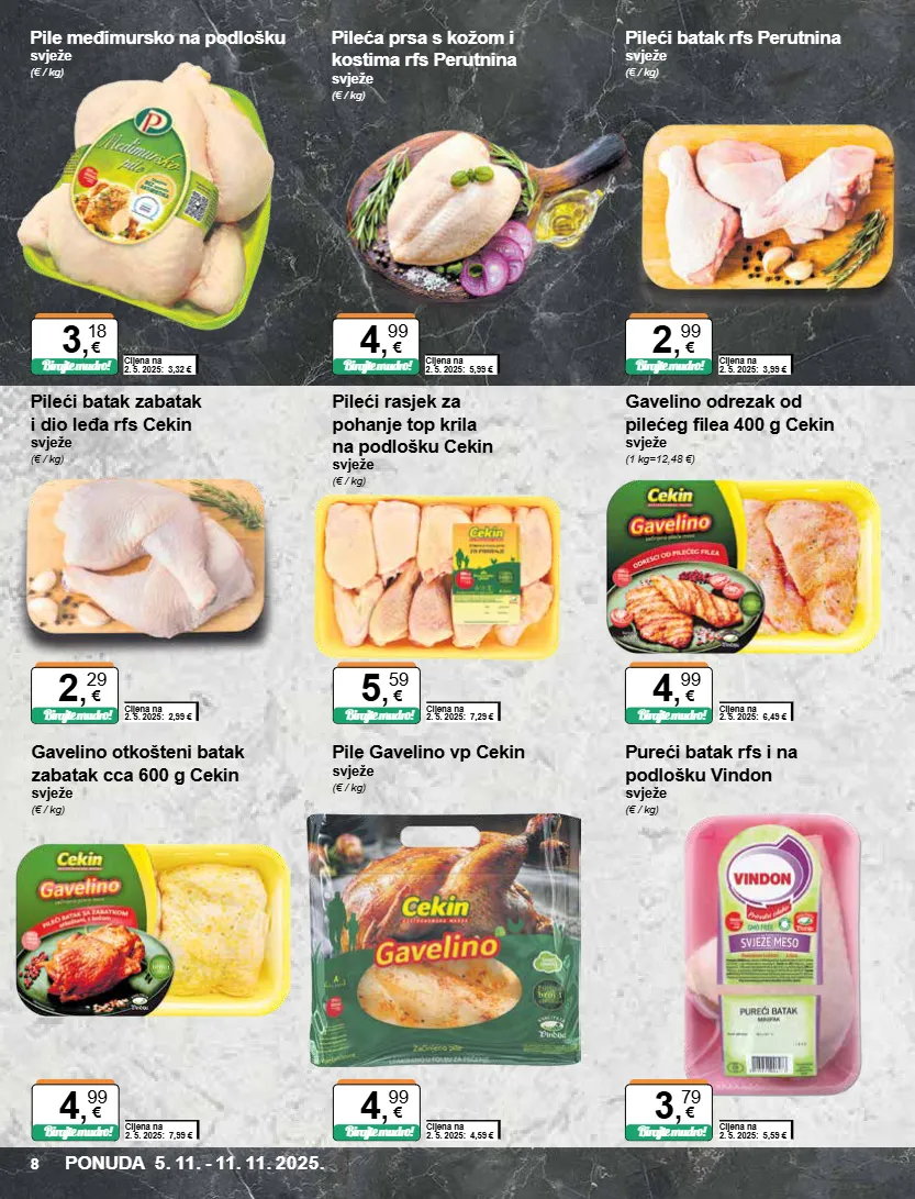 cijena na 2. 5. 2025: 3,32 € cijena na 2. 5. 2025: 5,99 € cijena na 2. 5. 2025: 3,99 € cijena na 2. 5. 2025: 2,99 € cijena na 2. 5. 2025: 7,29 € cijena na 2. 5. 2025: 6,49 € cijena na 2. 5. 2025: 7,99 € cijena na 2. 5. 2025: 4,59 € cijena na 2. 5. 2025: 5,59 €  pile međimursko na podlošku svježe  (€ / kg)  birajte mudro!  3 , 18  €  pileća prsa s kožom i  kostima rfs perutnina  svježe  (€ / kg)  birajte mudro!  4 , 99  €  pileći batak rfs perutnina svježe  (€ / kg)  birajte mudro!  2 , 99  €  pileći batak zabatak i dio leđa rfs cekin svježe  (€ / kg)  birajte mudro!  2 , 29  €  pileći rasjek za  pohanje top krila na podlošku cekin  svježe  (€ / kg)  birajte mudro!  5 , 59  €  gavelino odrezak od pilećeg filea 400 g cekin svježe  (1 kg=12,48 €)  birajte mudro!  4 , 99  € gavelino otkošteni batak  zabatak cca 600 g cekin svježe  (€ / kg)  birajte mudro!  4 , 99  € pile gavelino vp cekin  svježe  (€ / kg)  birajte mudro!  4 , 99  €  pureći batak rfs i na  podlošku vindon  svježe  (€ / kg)  birajte mudro!  3 , 79  € ponuda 5. 11. - 11. 11. 2025.  8