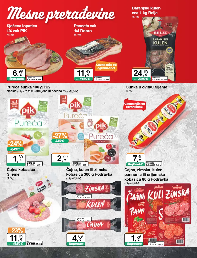 cijena na 2. 5. 2025: 8,79 € cijena na 2. 5. 2025: 6,99 € cijena na 2. 5. 2025: 29,99 € cijena na 2. 5. 2025: 11,90 € cijena na 2. 5. 2025: 15,59 € cijena na 2. 5. 2025:   2,29 cijena na 2. 5. 2025:   2,69 cijena na 2. 5. 2025: 1,49 € cijena na 2. 5. 2025: 6,99 € cijena na 2. 5. 2025: 5,99 €  cijena niža od ograničene! cijena niža od ograničene!  šunka u ovitku sljeme  (€ / kg)  birajte mudro!  7 , 49  €  sječena lopatica 1/4 vak pik  (€ / kg)  birajte mudro!  6 , 99  € baranjski kulen cca 1 kg belje  (€ / kg)  29,99 €  24 , 99  € panceta vak 1/4 dobro  (€ / kg)  11,90 €  11 , 49  € -24%  2,49 €  -27%  2,89 €  čajna kobasica sljeme  (€ / kg)  -23%  15,59 €  11 , 99  €  pureća šunka 100 g pik  classic   (1 kg =18,90 €)   , dimljena ili pečena   (1 kg =20,90 €)  1 , 89  €   2 , 09  €  čajna, zimska, kulen,  pannonia ili srijemska kobasica 80 g podravka  (1 kg=19,88 €)  birajte mudro!  1 , 59  €  čajna, kulen ili zimska  kobasica 300 g podravka  (1 kg=15,63 €)  birajte mudro!  4 , 69  € 9 9  mesne prerađevine