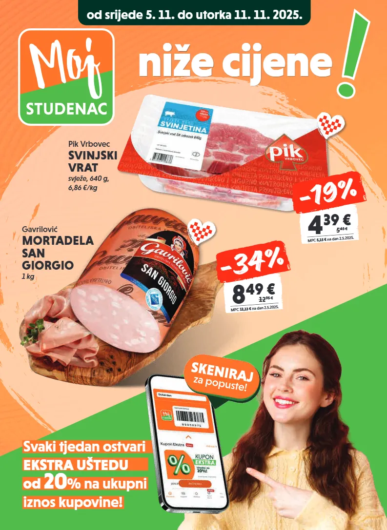 pik vrbovec  svinjski vrat  svježe, 640 g, 6,86 €/kg  4   39 €  mpc   5,15 €   na dan 2.5.2025.  5   45 €  -19%  od srijede 5. 11. do utorka 11. 11. 2025.  svaki tjedan ostvari  ekstra uštedu  od   20 %   na ukupni iznos kupovine!  niže cijene  gavrilović  mortadela san giorgio  1 kg  8   49 €  mpc   12,13 €   na dan 2.5.2025.  12   95 €  -34%