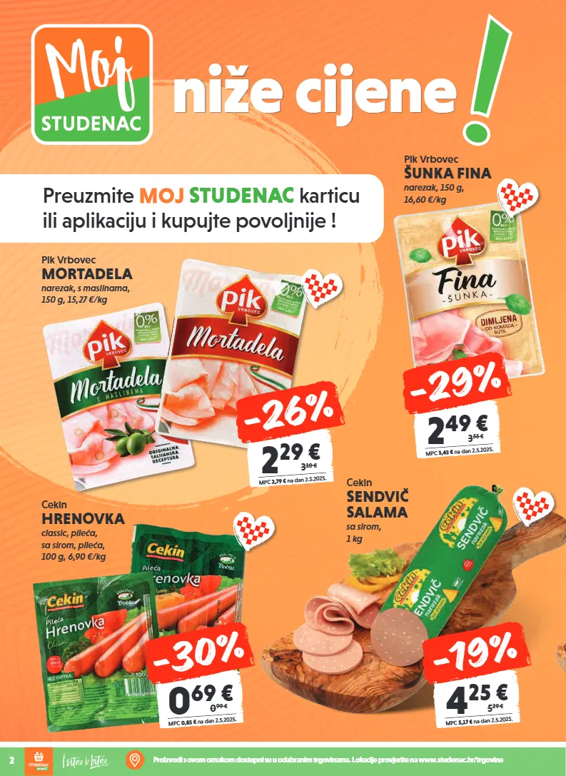preuzmite   moj studenac   karticu ili aplikaciju i kupujte povoljnije !  2   proizvodi s ovom oznakom dostupni su u odabranim trgovinama. lokacije provjerite na www.studenac.hr/trgovine  niže cijene  pik vrbovec  šunka fina  narezak, 150 g, 16,60 €/kg  0 69 €  mpc   0,85 €   na dan 2.5.2025.  0   99 €  -30%  4 25 €  mpc   5,17 €   na dan 2.5.2025.  5   29 €  -19%  cekin  hrenovka  classic, pileća, sa sirom, pileća, 100 g, 6,90 €/kg  cekin  sendvič salama  sa sirom, 1 kg  2 49 €  mpc   3,43 €   na dan 2.5.2025.  3   55 €  -29%  2   29 €  mpc   2,79 €   na dan 2.5.2025.  3   10 €  -26%  pik vrbovec  mortadela  narezak, s maslinama, 150 g, 15,27 €/kg