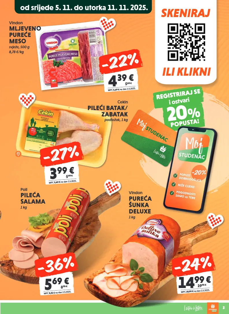 skeniraj ili klikni  3  registriraj se  i ostvari  20   % popusta!  poli  pileća salama  1 kg  vindon  pureća šunka deluxe  1 kg  cekin  pileći batak/ zabatak  podložak, 1 kg  14 99 €  mpc   18,99 €   na dan 2.5.2025.  19   95 €  -24%  4   39 €  mpc   5,69 €   na dan 2.5.2025.  5   69 €  -22%  3 99 €  mpc   5,49 €   na dan 2.5.2025.  5   49 €  -27%  vindon  mljeveno pureće meso  svježe, 500 g 8,78 €/kg  od srijede 5. 11. do utorka 11. 11. 2025.  5 69 €  mpc   8,31 €   na dan 2.5.2025.  8   95 €  -36%