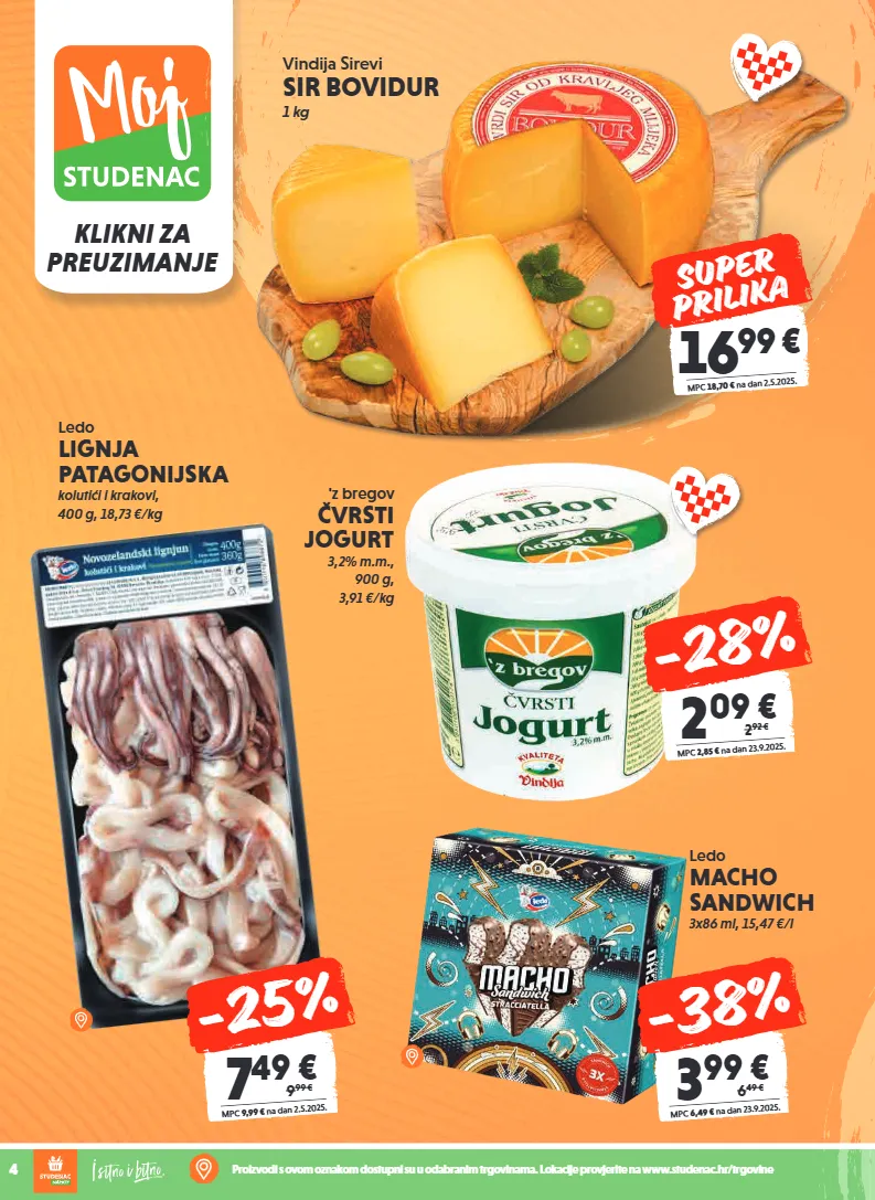 4   proizvodi s ovom oznakom dostupni su u odabranim trgovinama. lokacije provjerite na www.studenac.hr/trgovine  klikni za preuzimanje  'z bregov  čvrsti jogurt  3,2% m.m., 900 g, 3,91 €/kg  ledo  macho sandwich  3x86 ml, 15,47 €/l  3 99 €  mpc   6,49 €   na dan 23.9.2025.  6   49 €  -38%  2   09 €  mpc   2,85 €   na dan 23.9.2025.  2   92 €  -28%  ledo  lignja patagonijska  kolutići i krakovi, 400 g, 18,73 €/kg  7 49 €  mpc   9,99 €   na dan 2.5.2025.  9   99 €  -25%  vindija sirevi  sir bovidur  1 kg  16 99 €  mpc   18,70 €   na dan 2.5.2025.  super prilika