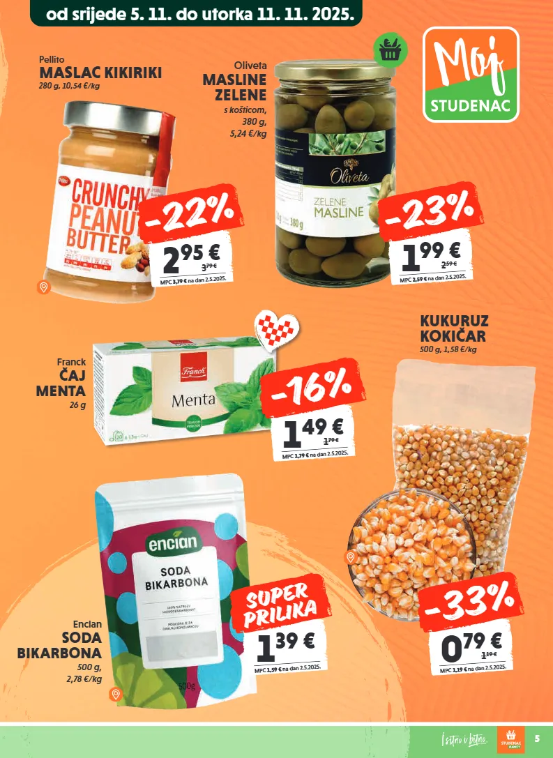 5  2 95 €  mpc   3,79 €   na dan 2.5.2025.  3   79 €  -22%  pellito  maslac kikiriki  280 g, 10,54 €/kg  encian  soda bikarbona  500 g, 2,78 €/kg  1   39 €  mpc   1,59 €   na dan 2.5.2025.  super prilika  franck  čaj menta  26 g  oliveta  masline zelene  s košticom, 380 g, 5,24 €/kg  0 79 €  mpc   1,19 €   na dan 2.5.2025.  1   19 €  -33%  1   49 €  mpc   1,79 €   na dan 2.5.2025.  1   79 €  -16%  1 99 €  mpc   2,59 €   na dan 2.5.2025.  2   59 €  -23%  kukuruz kokičar  500 g, 1,58 €/kg  od srijede 5. 11. do utorka 11. 11. 2025.