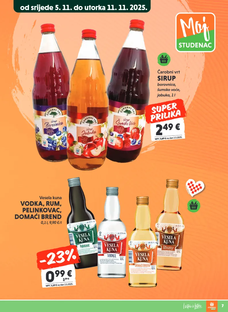 7  2 49 €  mpc   2,89 €   na dan 2.5.2025.  super prilika  čarobni vrt  sirup  borovnica, šumsko voće, jabuka, 1 l  0 99 €  mpc   1,19 €   na dan 2.5.2025.  1   29 €  -23%  vesela kuna  vodka, rum, pelinkovac, domaći brend  0,1 l, 9,90 €/l  od srijede 5. 11. do utorka 11. 11. 2025.