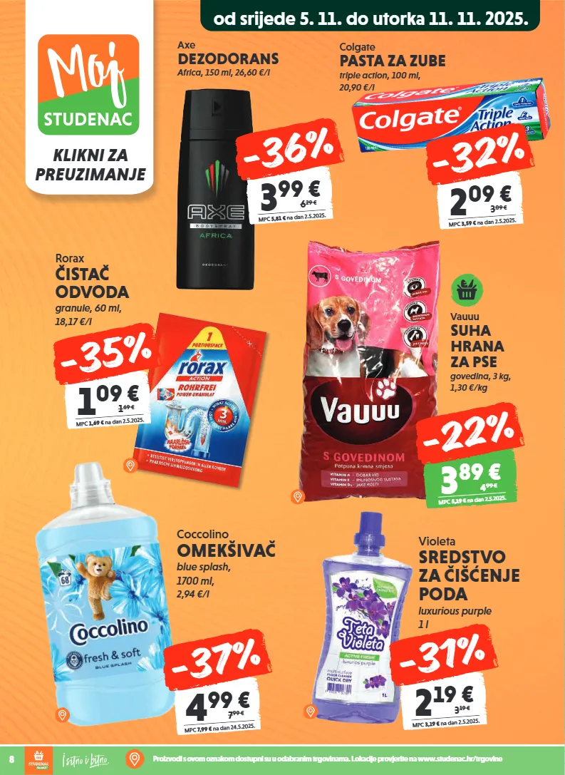 8   proizvodi s ovom oznakom dostupni su u odabranim trgovinama. lokacije provjerite na www.studenac.hr/trgovine  klikni za preuzimanje  od srijede 5. 11. do utorka 11. 11. 2025.  violeta  sredstvo za čišćenje poda  luxurious purple 1 l  coccolino  omekšivač  blue splash, 1700 ml, 2,94 €/l  1 09 €  mpc   1,69 €   na dan 2.5.2025.  1   69 €  -35%  rorax  čistač odvoda  granule, 60 ml, 18,17 €/l  2   19 €  mpc   3,19 €   na dan 2.5.2025.  3   19 €  -31%  4 99 €  mpc   7,99 €   na dan 24.5.2025.  7   99 €  -37%  3 99 €  mpc   5,81 €   na dan 2.5.2025.  6   29 €  -36%  colgate  pasta za zube  triple action, 100 ml, 20,90 €/l  2   09 €  mpc   3,59 €   na dan 2.5.2025.  3   09 €  -32%  3   89 €  mpc   5,19 €   na dan 2.5.2025.  4 99 €  -22%  vauuu  suha hrana za pse  govedina, 3 kg, 1,30 €/kg  axe  dezodorans  africa, 150 ml, 26,60 €/l