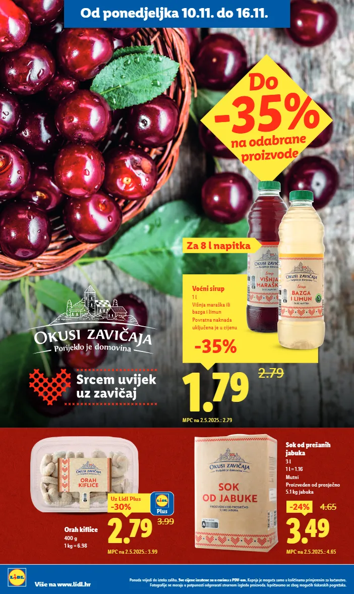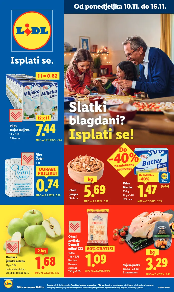 izdanje 46/2025 ponuda vrijedi do isteka zaliha. sve cijene izražene su u eurima s pdv-om. kupnja je moguća samo u količinama primjerenim za kućanstvo. fotografije ne moraju u potpunosti odgovarati stvarnom izgledu proizvoda. ispričavamo se zbog mogućih tiskarskih pogrešaka. više na www.lidl.hr od ponedjeljka 10.11. do 16.11. svježa patka cca 1.9 - 2.6 kg s iznutricama pilos trajno mlijeko 1 l = 0.62 2,8% m.m. slatki blagdani? isplati se! okusi zavičaja domaći mlinci xxl 400 g 1 kg = 2.73 bez jaja redovna cijena za 250 g = 1.09 3.29 kg mpc na 2.5.2025.: 2.49 orah jezgra rinfuza 7.44 12 x 1 l mpc na 10.11.2025.: 7.44 viro šećer 1 kg 0.74 ugrabi priliku! mpc na 2.5.2025.: 0.79 pilos maslac 250 g 1 kg = 5.88 82% m.m. 2.49 1.47 -40% uz lidl plus mpc na 2.5.2025.: 2.75 do -40% na odabrane proizvode 1 l = 0.62 5.69 kg mpc na 2.5.2025.: 5.49 1.09 60% gratis! mpc na 2.5.2025.: 0.99 domaća jabuka zelena 1 kg = 0.84 sorta: zlatni delišes vrijedi do srijede, 12.11. 1.68 2 kg mpc na 2.5.2025.: 1.99