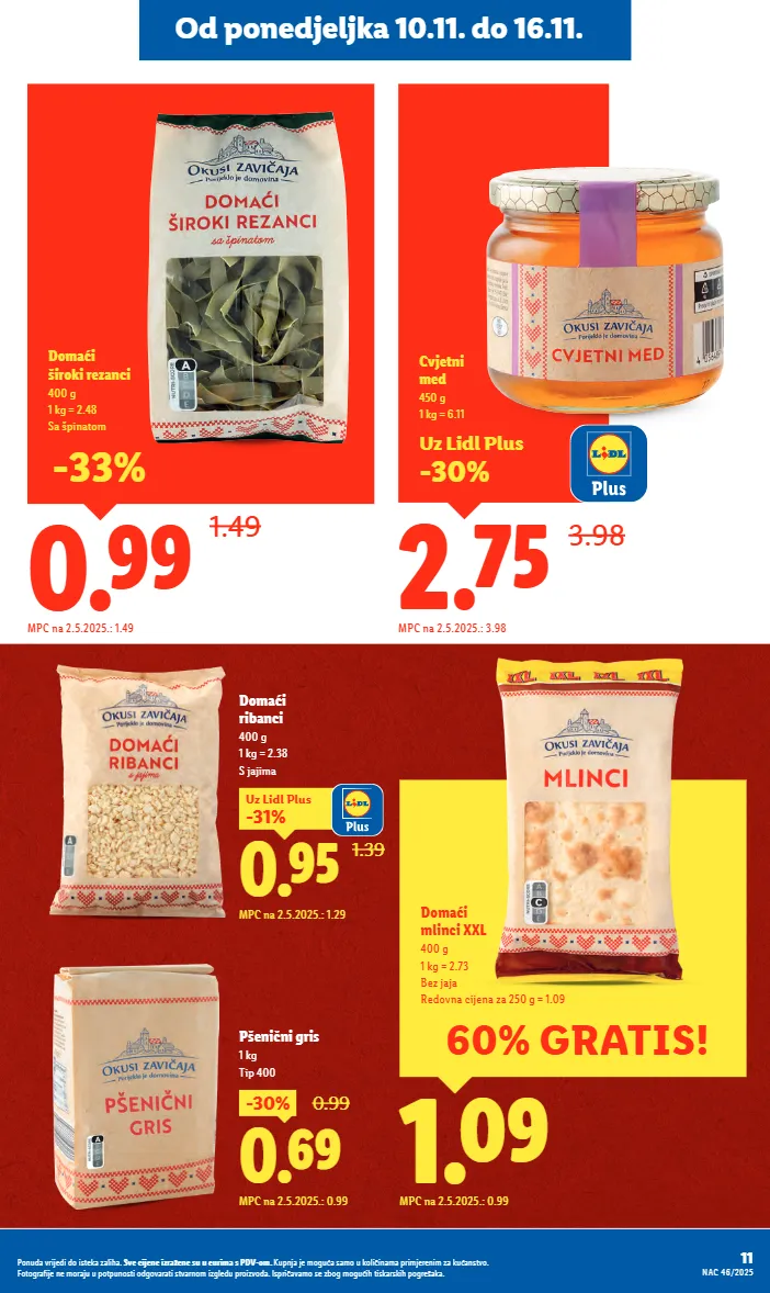 0.99 1.49 domaći široki rezanci 400 g 1 kg = 2.48 sa špinatom mpc na 2.5.2025.: 1.49 -33% uz lidl plus -30% 2.75 3.98 cvjetni med 450 g 1 kg = 6.11 mpc na 2.5.2025.: 3.98 domaći ribanci 400 g 1 kg = 2.38 s jajima pšenični gris 1 kg tip 400 0.69 -30% 0.99 mpc na 2.5.2025.: 0.99 1.39 0.95 -31% uz lidl plus mpc na 2.5.2025.: 1.29 1.09 mpc na 2.5.2025.: 0.99 60% gratis! domaći mlinci xxl 400 g 1 kg = 2.73 bez jaja redovna cijena za 250 g = 1.09 od ponedjeljka 10.11. do 16.11. 11 nac 46/2025 ponuda vrijedi do isteka zaliha. sve cijene izražene su u eurima s pdv-om. kupnja je moguća samo u količinama primjerenim za kućanstvo. fotografije ne moraju u potpunosti odgovarati stvarnom izgledu proizvoda. ispričavamo se zbog mogućih tiskarskih pogrešaka.