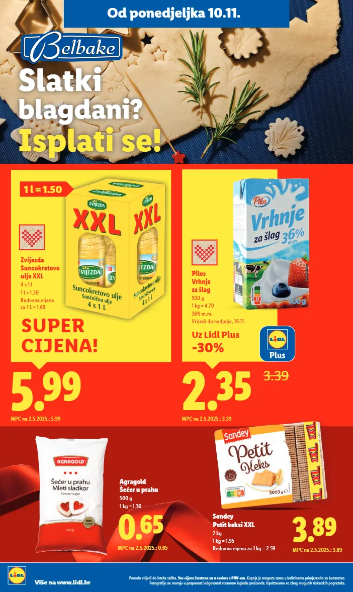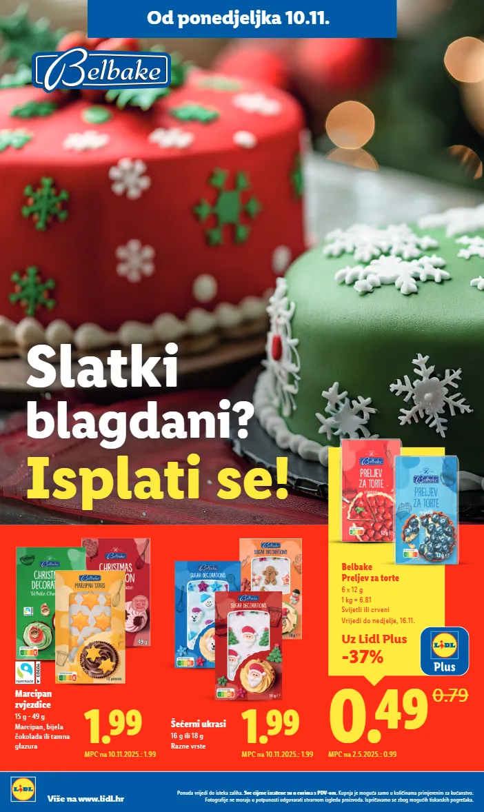 1.99 MPC na 10.11.2025.: 1.99 Marcipan zvjezdice 15 g - 49 g Marcipan, bijela čokolada ili tamna glazura 1.99 MPC na 10.11.2025.: 1.99 Šećerni ukrasi 16 g ili 18 g Razne vrste Uz Lidl Plus -37% 0.49 0.79 Belbake Preljev za torte 6 x 12 g 1 kg = 6.81 Svijetli ili crveni Vrijedi do nedjelje, 16.11. MPC na 2.5.2025.: 0.99 Slatki blagdani? Isplati se! Od ponedjeljka 10.11. Ponuda vrijedi do isteka zaliha. Sve cijene izražene su u eurima s PDV-om. Kupnja je moguća samo u količinama primjerenim za kućanstvo. Fotografije ne moraju u potpunosti odgovarati stvarnom izgledu proizvoda. Ispričavamo se zbog mogućih tiskarskih pogrešaka. Više na www.lidl.hr