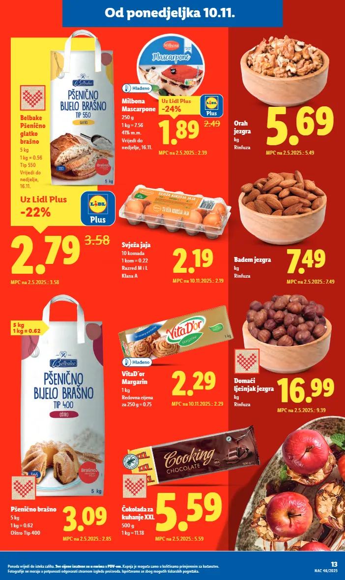 3.09 mpc na 2.5.2025.: 2.85 pšenično brašno 5 kg 1 kg = 0.62 oštro tip 400 5 kg 1 kg = 0.62 orah jezgra kg rinfuza 2.49 1.89 -24% uz lidl plus mpc na 2.5.2025.: 2.39 milbona mascarpone 250 g 1 kg = 7.56 41% m.m. vrijedi do nedjelje, 16.11. 2.29 mpc na 10.11.2025.: 2.29 vitad´or margarin 1 kg redovna cijena za 250 g = 0.75 7.49 mpc na 2.5.2025.: 7.49 badem jezgra kg rinfuza 16.99 mpc na 2.5.2025.: 9.39 domaći lješnjak jezgra kg rinfuza 2.19 mpc na 10.11.2025.: 2.19 svježa jaja 10 komada 1 kom = 0.22 razred m i l klasa a 5.69 mpc na 2.5.2025.: 5.49 uz lidl plus -22% 2.79 3.58 belbake pšenično glatko brašno 5 kg 1 kg = 0.56 tip 550 vrijedi do nedjelje, 16.11. mpc na 2.5.2025.: 3.58 čokolada za kuhanje xxl 500 g 1 kg = 11.18 5.59 mpc na 2.5.2025.: 5.59 13 nac 46/2025 ponuda vrijedi do isteka zaliha. sve cijene izražene su u eurima s pdv-om. kupnja je moguća samo u količinama primjerenim za kućanstvo. fotografije ne moraju u potpunosti odgovarati stvarnom izgledu proizvoda. ispričavamo se zbog mogućih tiskarskih pogrešaka. od ponedjeljka 10.11.