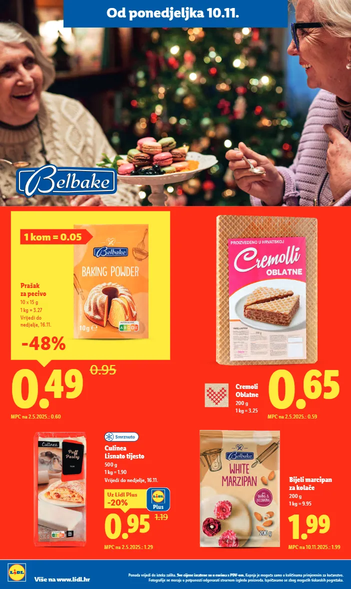 Culinea Lisnato tijesto 500 g 1 kg = 1.90 Vrijedi do nedjelje, 16.11. 1.19 0.95 -20% Uz Lidl Plus MPC na 2.5.2025.: 1.29 1.99 MPC na 10.11.2025.: 1.99 Bijeli marcipan za kolače 200 g 1 kg = 9.95 0.49 0.95 Prašak za pecivo 10 x 15 g 1 kg = 3.27 Vrijedi do nedjelje, 16.11. MPC na 2.5.2025.: 0.60 -48% Cremoli Oblatne 200 g 1 kg = 3.25 0.65 MPC na 2.5.2025.: 0.59 1 kom = 0.05 Od ponedjeljka 10.11. Ponuda vrijedi do isteka zaliha. Sve cijene izražene su u eurima s PDV-om. Kupnja je moguća samo u količinama primjerenim za kućanstvo. Fotografije ne moraju u potpunosti odgovarati stvarnom izgledu proizvoda. Ispričavamo se zbog mogućih tiskarskih pogrešaka. Više na www.lidl.hr