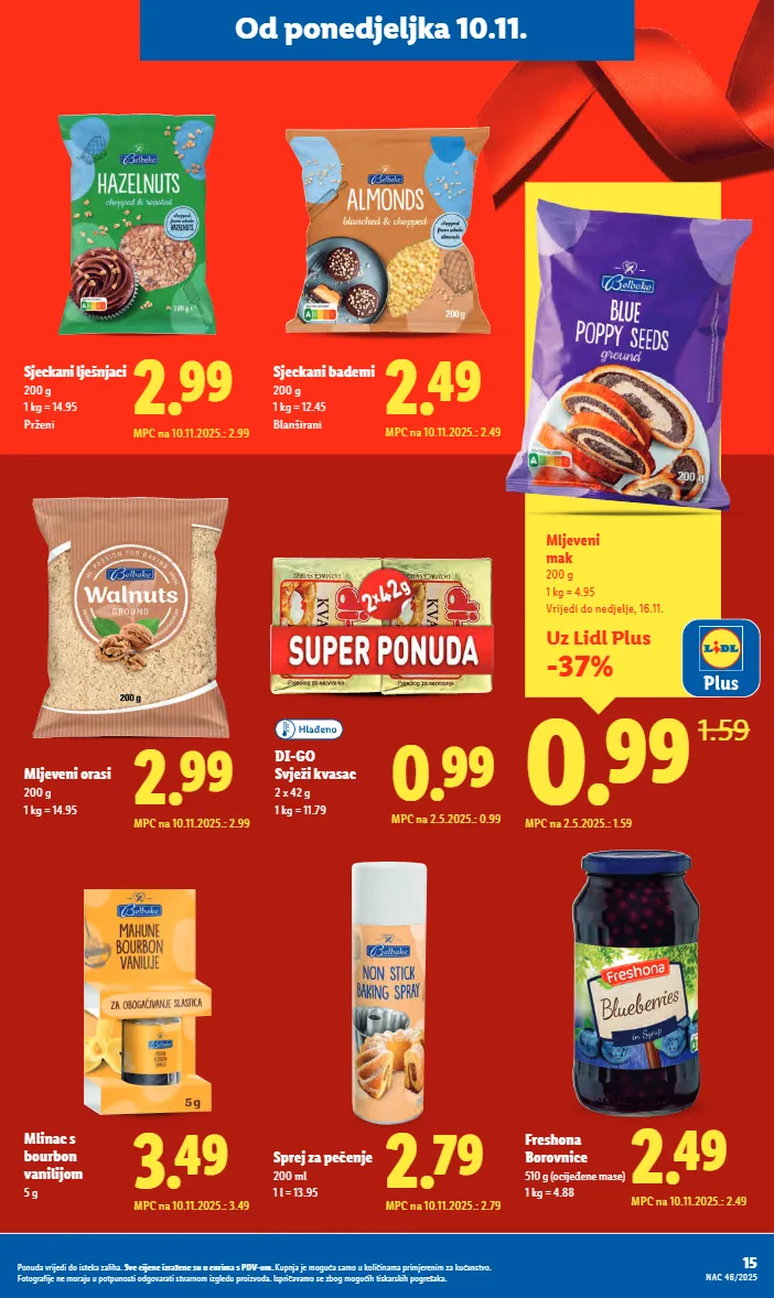 0.99 mpc na 2.5.2025.: 0.99 di-go svježi kvasac 2 x 42 g 1 kg = 11.79 2.99 mpc na 10.11.2025.: 2.99 sjeckani lješnjaci 200 g 1 kg = 14.95 prženi 2.99 mpc na 10.11.2025.: 2.99 mljeveni orasi 200 g 1 kg = 14.95 2.49 mpc na 10.11.2025.: 2.49 sjeckani bademi 200 g 1 kg = 12.45 blanširani 2.49 mpc na 10.11.2025.: 2.49 freshona borovnice 510 g (ocijeđene mase) 1 kg = 4.88 2.79 mpc na 10.11.2025.: 2.79 sprej za pečenje 200 ml 1 l = 13.95 3.49 mpc na 10.11.2025.: 3.49 mlinac s bourbon vanilijom 5 g uz lidl plus -37% 0.99 1.59 mljeveni mak 200 g 1 kg = 4.95 vrijedi do nedjelje, 16.11. mpc na 2.5.2025.: 1.59 od ponedjeljka 10.11. 15 nac 46/2025 ponuda vrijedi do isteka zaliha. sve cijene izražene su u eurima s pdv-om. kupnja je moguća samo u količinama primjerenim za kućanstvo. fotografije ne moraju u potpunosti odgovarati stvarnom izgledu proizvoda. ispričavamo se zbog mogućih tiskarskih pogrešaka.