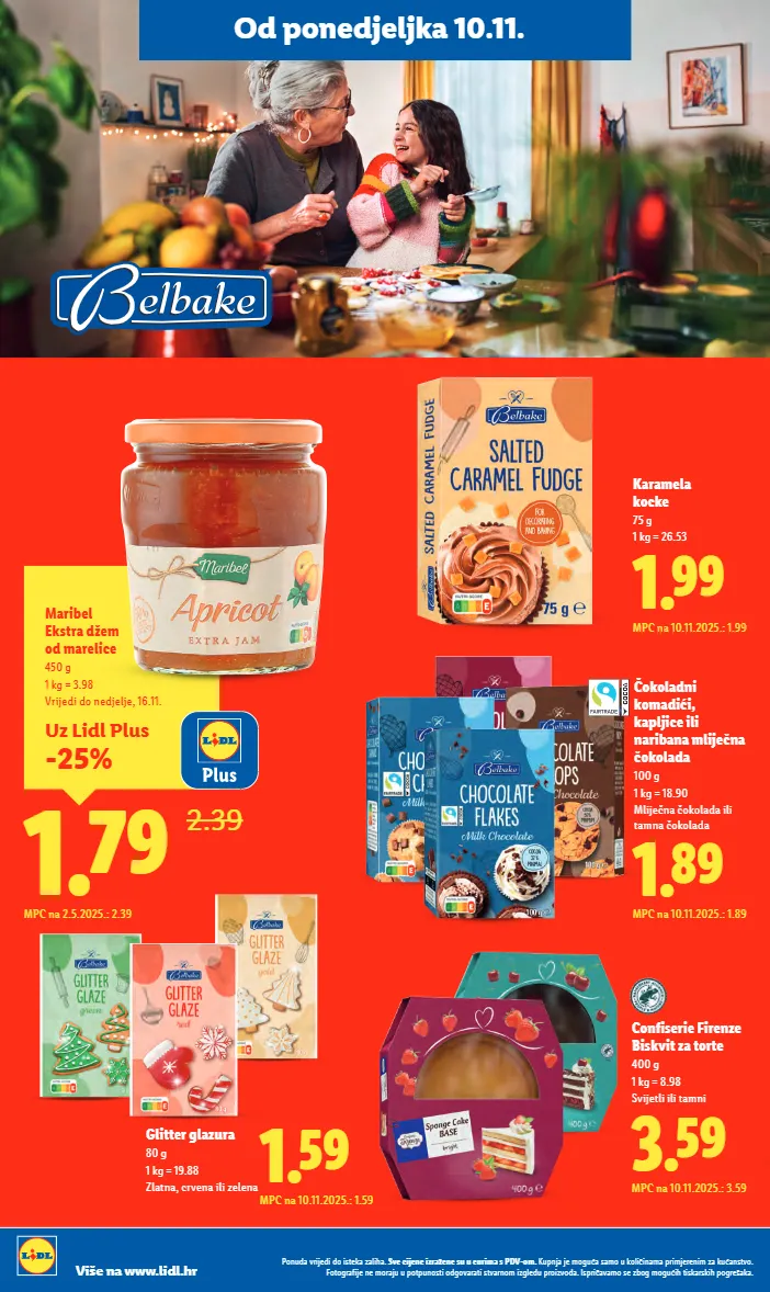 3.59 MPC na 10.11.2025.: 3.59 Confiserie Firenze Biskvit za torte 400 g 1 kg = 8.98 Svijetli ili tamni 1.99 MPC na 10.11.2025.: 1.99 Karamela kocke 75 g 1 kg = 26.53 1.59 MPC na 10.11.2025.: 1.59 Glitter glazura 80 g 1 kg = 19.88 Zlatna, crvena ili zelena 1.89 MPC na 10.11.2025.: 1.89 Uz Lidl Plus -25% 1.79 2.39 Maribel Ekstra džem od marelice 450 g 1 kg = 3.98 Vrijedi do nedjelje, 16.11. MPC na 2.5.2025.: 2.39 Čokoladni komadići, kapljice ili naribana mliječna čokolada 100 g 1 kg = 18.90 Mliječna čokolada ili tamna čokolada Od ponedjeljka 10.11. Ponuda vrijedi do isteka zaliha. Sve cijene izražene su u eurima s PDV-om. Kupnja je moguća samo u količinama primjerenim za kućanstvo. Fotografije ne moraju u potpunosti odgovarati stvarnom izgledu proizvoda. Ispričavamo se zbog mogućih tiskarskih pogrešaka. Više na www.lidl.hr