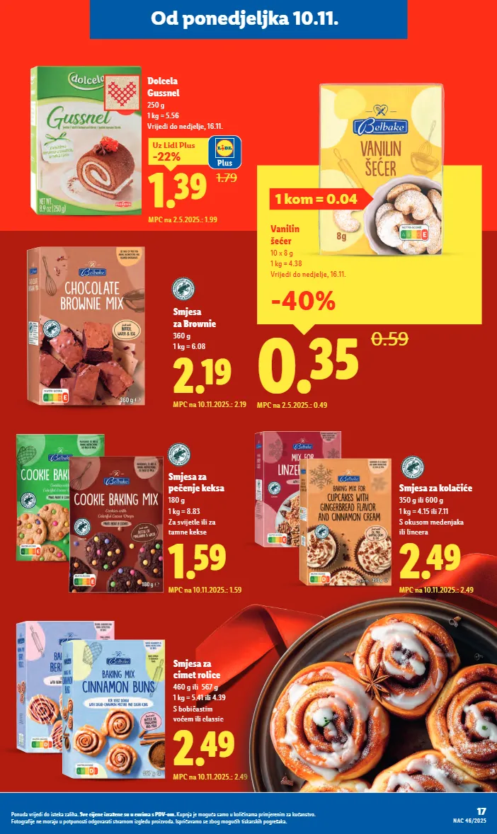 2.19 MPC na 10.11.2025.: 2.19 Smjesa za Brownie 360 g 1 kg = 6.08 1.59 MPC na 10.11.2025.: 1.59 Smjesa za pečenje keksa 180 g 1 kg = 8.83 Za svijetle ili za tamne kekse 2.49 MPC na 10.11.2025.: 2.49 Smjesa za cimet rolice 460 g ili 567 g 1 kg = 5.41 ili 4.39 S bobičastim voćem ili classic 0.35 0.59 Vanilin šećer 10 x 8 g 1 kg = 4.38 Vrijedi do nedjelje, 16.11. MPC na 2.5.2025.: 0.49 -40% 2.49 MPC na 10.11.2025.: 2.49 Smjesa za kolačiće 350 g ili 600 g 1 kg = 4.15 ili 7.11 S okusom medenjaka ili lincera Dolcela Gussnel 250 g 1 kg = 5.56 Vrijedi do nedjelje, 16.11. 1.79 1.39 -22% Uz Lidl Plus MPC na 2.5.2025.: 1.99 1 kom = 0.04 Od ponedjeljka 10.11. 17 NAC 46/2025 Ponuda vrijedi do isteka zaliha. Sve cijene izražene su u eurima s PDV-om. Kupnja je moguća samo u količinama primjerenim za kućanstvo. Fotografije ne moraju u potpunosti odgovarati stvarnom izgledu proizvoda. Ispričavamo se zbog mogućih tiskarskih pogrešaka.