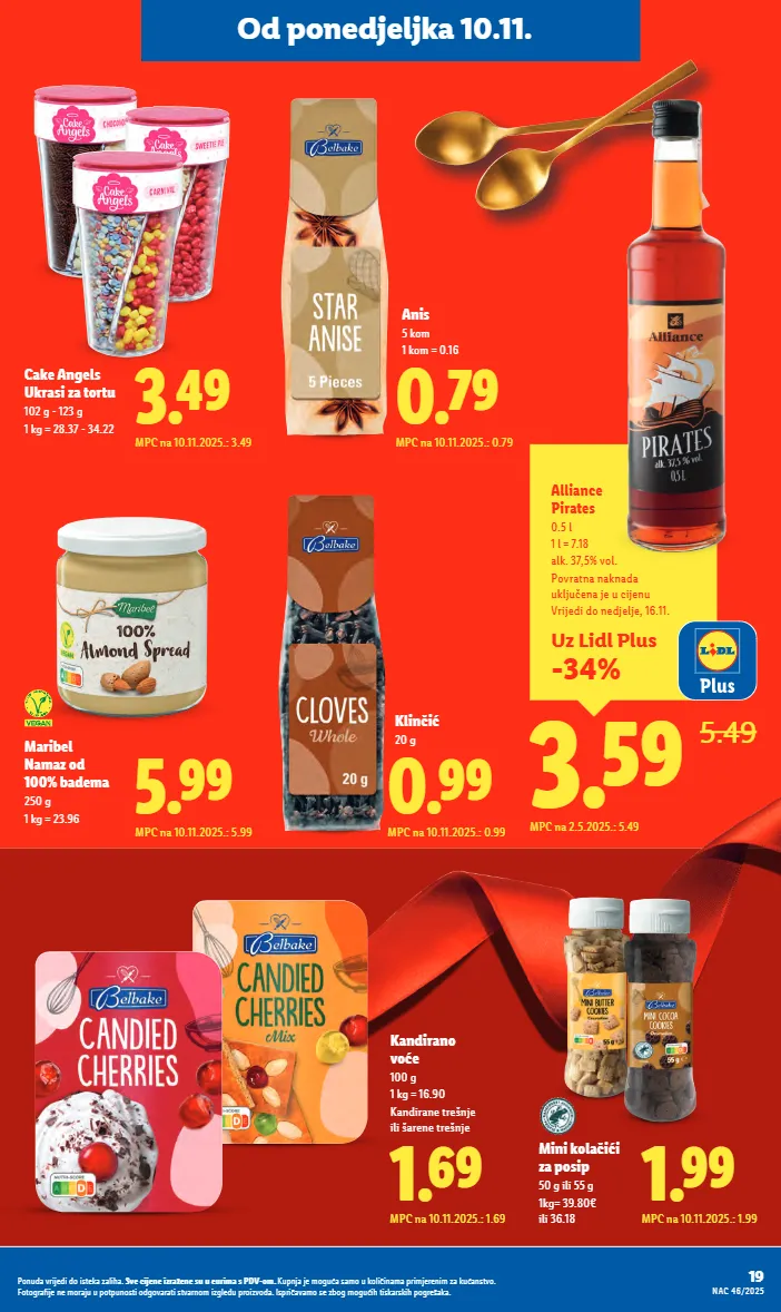 3.49 MPC na 10.11.2025.: 3.49 Cake Angels Ukrasi za tortu 102 g - 123 g 1 kg = 28.37 - 34.22 1.69 MPC na 10.11.2025.: 1.69 Kandirano voće 100 g 1 kg = 16.90 Kandirane trešnje ili šarene trešnje 5.99 MPC na 10.11.2025.: 5.99 Maribel Namaz od 100% badema 250 g 1 kg = 23.96 1.99 MPC na 10.11.2025.: 1.99 Mini kolačići za posip 50 g ili 55 g 1kg= 39.80€ ili 36.18 0.79 MPC na 10.11.2025.: 0.79 Anis 5 kom 1 kom = 0.16 Uz Lidl Plus -34% 3.59 5.49 Alliance Pirates 0.5 l 1 l = 7.18 alk. 37,5% vol. Povratna naknada uključena je u cijenu Vrijedi do nedjelje, 16.11. MPC na 2.5.2025.: 5.49 0.99 MPC na 10.11.2025.: 0.99 Klinčić 20 g Od ponedjeljka 10.11. 19 NAC 46/2025 Ponuda vrijedi do isteka zaliha. Sve cijene izražene su u eurima s PDV-om. Kupnja je moguća samo u količinama primjerenim za kućanstvo. Fotografije ne moraju u potpunosti odgovarati stvarnom izgledu proizvoda. Ispričavamo se zbog mogućih tiskarskih pogrešaka.