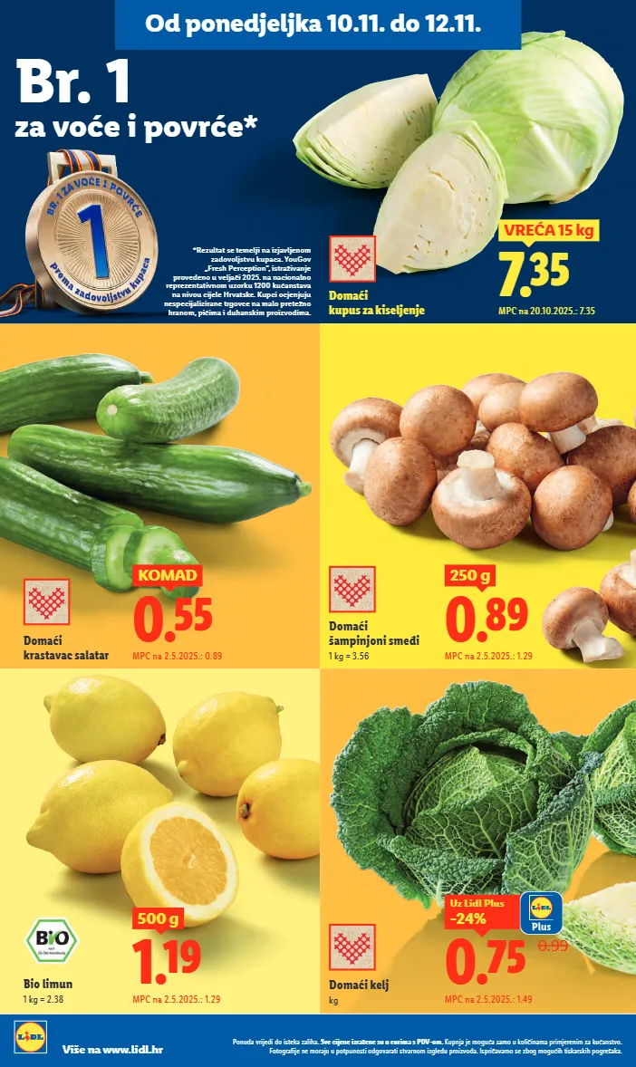 br. 1 za voće i povrće* *rezultat se temelji na izjavljenom zadovoljstvu kupaca. yougov „fresh perception”, istraživanje provedeno u veljači 2025. na nacionalno reprezentativnom uzorku 1200 kućanstava na nivou cijele hrvatske. kupci ocjenjuju nespecijalizirane trgovce na malo pretežno hranom, pićima i duhanskim proizvodima. domaći kelj kg domaći šampinjoni smeđi 1 kg = 3.56 od ponedjeljka 10.11. do 12.11. ponuda vrijedi do isteka zaliha. sve cijene izražene su u eurima s pdv-om. kupnja je moguća samo u količinama primjerenim za kućanstvo. fotografije ne moraju u potpunosti odgovarati stvarnom izgledu proizvoda. ispričavamo se zbog mogućih tiskarskih pogrešaka. više na www.lidl.hr bio limun 1 kg = 2.38 mpc na 2.5.2025.: 1.49 0.99 0.75 -24% uz lidl plus 0.89 250 g mpc na 2.5.2025.: 1.29 domaći krastavac salatar 0.55 komad mpc na 2.5.2025.: 0.89 1.19 500 g mpc na 2.5.2025.: 1.29 domaći kupus za kiseljenje 7.35 vreća 15 kg mpc na 20.10.2025.: 7.35