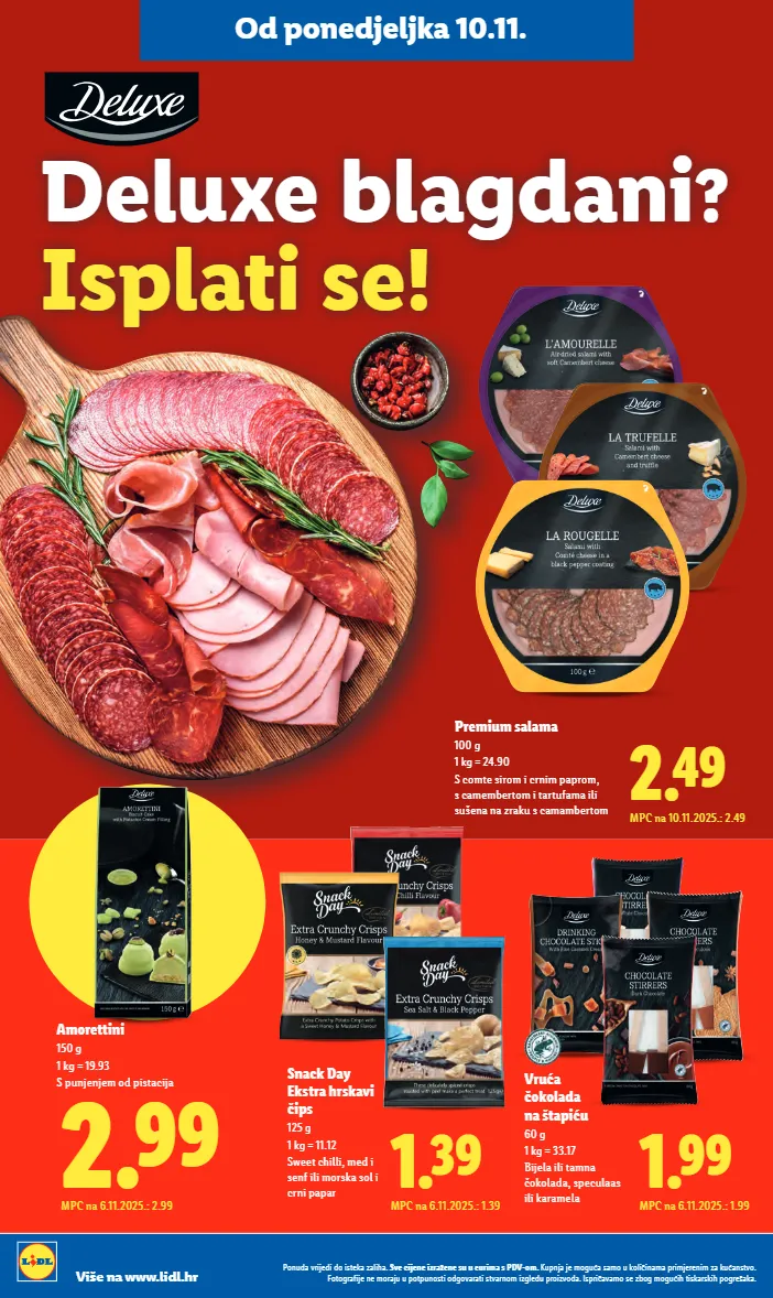 2.49 mpc na 10.11.2025.: 2.49 premium salama 100 g 1 kg = 24.90 s comte sirom i crnim paprom, s camembertom i tartufama ili sušena na zraku s camambertom 1.99 mpc na 6.11.2025.: 1.99 vruća čokolada na štapiću 60 g 1 kg = 33.17 bijela ili tamna čokolada, speculaas ili karamela 1.39 mpc na 6.11.2025.: 1.39 snack day ekstra hrskavi čips 125 g 1 kg = 11.12 sweet chilli, med i senf ili morska sol i crni papar 2.99 mpc na 6.11.2025.: 2.99 amorettini 150 g 1 kg = 19.93 s punjenjem od pistacija deluxe blagdani ? isplati se! ponuda vrijedi do isteka zaliha. sve cijene izražene su u eurima s pdv-om. kupnja je moguća samo u količinama primjerenim za kućanstvo. fotografije ne moraju u potpunosti odgovarati stvarnom izgledu proizvoda. ispričavamo se zbog mogućih tiskarskih pogrešaka. više na www.lidl.hr od ponedjeljka 10.11.