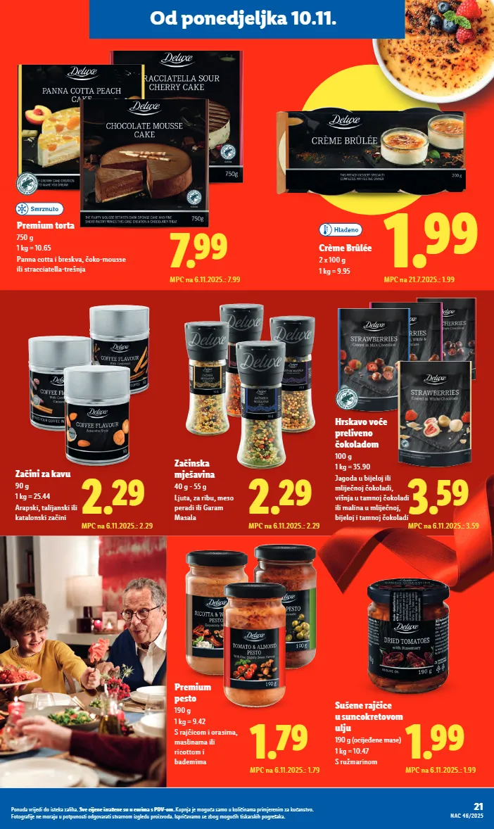 crème brûlée 2 x 100 g 1 kg = 9.95 2.29 mpc na 6.11.2025.: 2.29 začinska mješavina 40 g - 55 g ljuta, za ribu, meso peradi ili garam masala 3.59 mpc na 6.11.2025.: 3.59 hrskavo voće preliveno čokoladom 100 g 1 kg = 35.90 jagoda u bijeloj ili mliječnoj čokoladi, višnja u tamnoj čokoladi ili malina u mliječnoj, bijeloj i tamnoj čokoladi 2.29 mpc na 6.11.2025.: 2.29 začini za kavu 90 g 1 kg = 25.44 arapski, talijanski ili katalonski začini 1.99 mpc na 6.11.2025.: 1.99 sušene rajčice u suncokretovom ulju 190 g (ocijeđene mase) 1 kg = 10.47 s ružmarinom 7.99 mpc na 6.11.2025.: 7.99 premium torta 750 g 1 kg = 10.65 panna cotta i breskva, čoko-mousse ili stracciatella-trešnja 1.79 mpc na 6.11.2025.: 1.79 premium pesto 190 g 1 kg = 9.42 s rajčicom i orasima, maslinama ili ricottom i bademima 1.99 mpc na 21.7.2025.: 1.99 21 nac 46/2025 ponuda vrijedi do isteka zaliha. sve cijene izražene su u eurima s pdv-om. kupnja je moguća samo u količinama primjerenim za kućanstvo. fotografije ne moraju u potpunosti odgovarati stvarnom izgledu proizvoda. ispričavamo se zbog mogućih tiskarskih pogrešaka. od ponedjeljka 10.11.