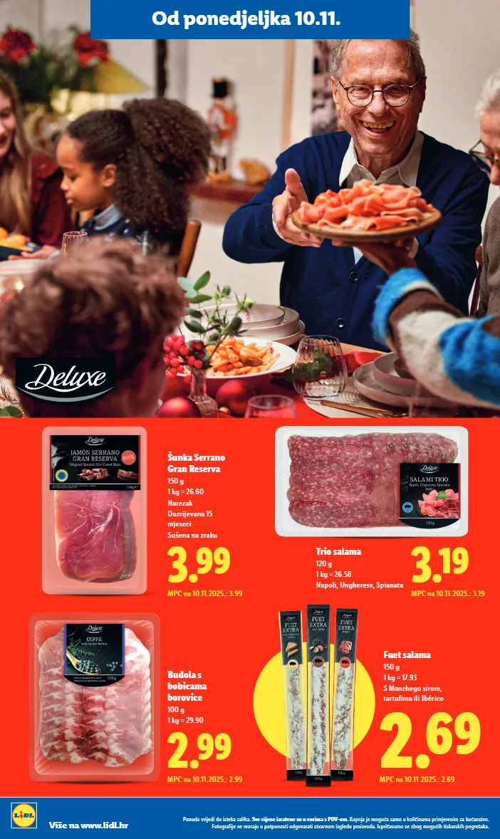 Fuet salama 150 g 1 kg = 17.93 S Manchego sirom, tartufima ili Ibérico 3.19 MPC na 10.11.2025.: 3.19 Trio salama 120 g 1 kg = 26.58 Napoli, Ungherese, Spianata 2.99 MPC na 10.11.2025.: 2.99 Buđola s bobicama borovice 100 g 1 kg = 29.90 3.99 MPC na 10.11.2025.: 3.99 Šunka Serrano Gran Reserva 150 g 1 kg = 26.60 Narezak Dozrijevana 15 mjeseci Sušena na zraku 2.69 MPC na 10.11.2025.: 2.69 Od ponedjeljka 10.11. Ponuda vrijedi do isteka zaliha. Sve cijene izražene su u eurima s PDV-om. Kupnja je moguća samo u količinama primjerenim za kućanstvo. Fotografije ne moraju u potpunosti odgovarati stvarnom izgledu proizvoda. Ispričavamo se zbog mogućih tiskarskih pogrešaka. Više na www.lidl.hr