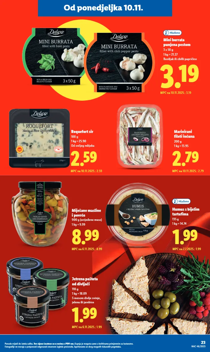 mini burrata punjena pestom 3 x 50 g 1 kg = 21.27 bosiljak ili chilli papričice 2.59 mpc na 10.11.2025.: 2.59 roquefort sir 100 g 1 kg = 25.90 od ovčjeg mlijeka 1.99 mpc na 7.7.2025.: 1.99 humus s bijelim tartufima 135 g 1 kg = 14.74 8.99 mpc na 6.11.2025.: 8.99 miješane masline i povrće 900 g (ocijeđene mase) 1 kg = 9.99 1.99 mpc na 6.11.2025.: 1.99 jetrena pašteta od divljači 110 g 1 kg = 18.09 s mesom divlje svinje, jelena ili jarebice 3.19 mpc na 10.11.2025.: 3.19 2.79 mpc na 10.11.2025.: 2.79 marinirani fileti inćuna 200 g 1 kg = 13.95 od ponedjeljka 10.11. 23 nac 46/2025 ponuda vrijedi do isteka zaliha. sve cijene izražene su u eurima s pdv-om. kupnja je moguća samo u količinama primjerenim za kućanstvo. fotografije ne moraju u potpunosti odgovarati stvarnom izgledu proizvoda. ispričavamo se zbog mogućih tiskarskih pogrešaka.