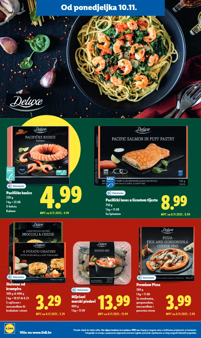 3.99 mpc na 6.11.2025.: 3.99 premium pizza 360 g 1 kg = 11.08 sa smokvama, gorgonzolom, mozzarellom i pecorino sirom 3.29 mpc na 6.11.2025.: 3.29 8.99 mpc na 6.11.2025.: 8.99 pacifički losos u lisnatom tijestu 750 g 1 kg = 11.99 sa špinatom pacifičke kozice 220 g 1 kg = 22.68 u kolutu kuhane 4.99 mpc na 6.11.2025.: 4.99 složenac od krumpira 300 g ili 400 g 1 kg = 10.97 ili 8.23 s rajčicom i mozzarellom ili brokulom i sirom 13.99 mpc na 6.11.2025.: 13.99 miješani morski plodovi 800 g 1 kg = 17.49 od ponedjeljka 10.11. ponuda vrijedi do isteka zaliha. sve cijene izražene su u eurima s pdv-om. kupnja je moguća samo u količinama primjerenim za kućanstvo. fotografije ne moraju u potpunosti odgovarati stvarnom izgledu proizvoda. ispričavamo se zbog mogućih tiskarskih pogrešaka. više na www.lidl.hr