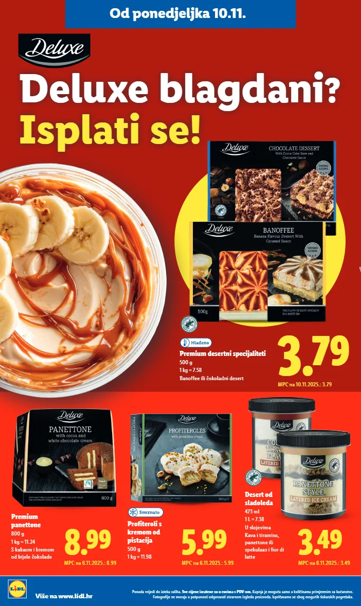 premium desertni specijaliteti 500 g 1 kg = 7.58 banoffee ili čokoladni desert 8.99 mpc na 6.11.2025.: 8.99 premium panettone 800 g 1 kg = 11.24 s kakaom i kremom od bijele čokolade 3.49 mpc na 6.11.2025.: 3.49 desert od sladoleda 473 ml 1 l = 7.38 u slojevima kava i tiramisu, panettone ili spekulaas i fior di latte 5.99 mpc na 6.11.2025.: 5.99 profiteroli s kremom od pistacija 500 g 1 kg = 11.98 3.79 mpc na 10.11.2025.: 3.79 deluxe blagdani ? isplati se! od ponedjeljka 10.11. ponuda vrijedi do isteka zaliha. sve cijene izražene su u eurima s pdv-om. kupnja je moguća samo u količinama primjerenim za kućanstvo. fotografije ne moraju u potpunosti odgovarati stvarnom izgledu proizvoda. ispričavamo se zbog mogućih tiskarskih pogrešaka. više na www.lidl.hr