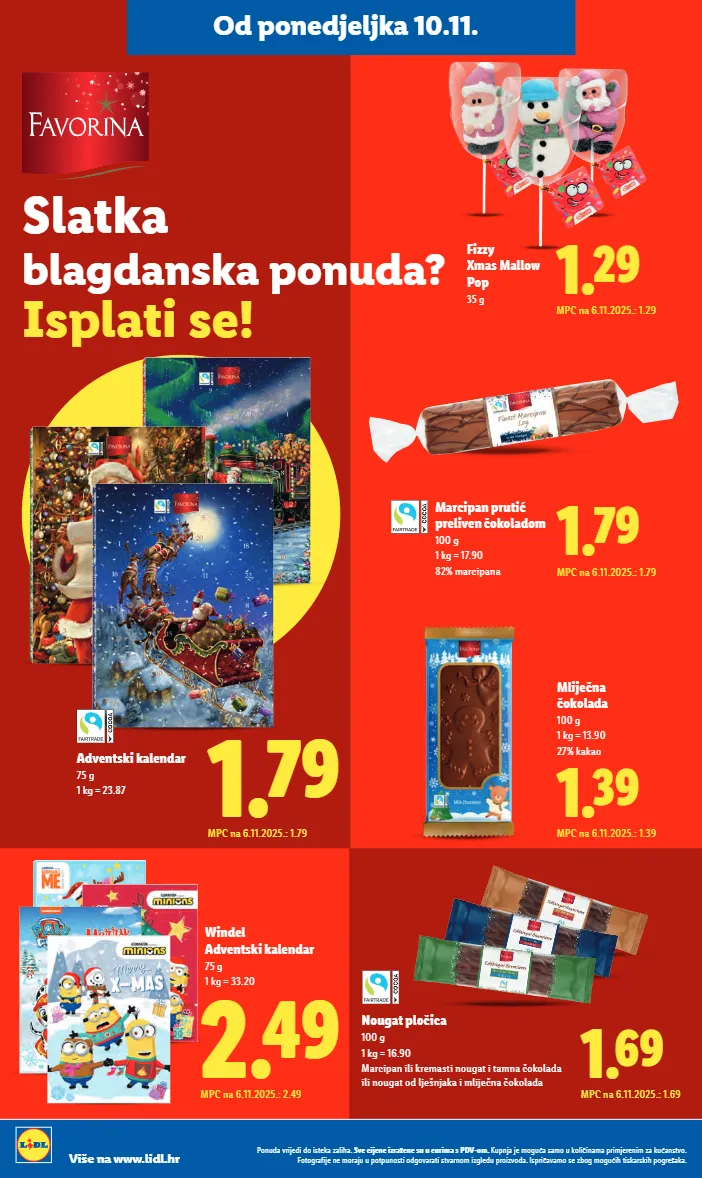 Slatka blagdanska ponuda? Isplati se! 1.79 MPC na 6.11.2025.: 1.79 Marcipan prutić preliven čokoladom 100 g 1 kg = 17.90 82% marcipana 1.39 MPC na 6.11.2025.: 1.39 Mliječna čokolada 100 g 1 kg = 13.90 27% kakao 1.29 MPC na 6.11.2025.: 1.29 Fizzy Xmas Mallow Pop 35 g 1.69 MPC na 6.11.2025.: 1.69 Nougat pločica 100 g 1 kg = 16.90 Marcipan ili kremasti nougat i tamna čokolada ili nougat od lješnjaka i mliječna čokolada 1.79 MPC na 6.11.2025.: 1.79 Adventski kalendar 75 g 1 kg = 23.87 Windel Adventski kalendar 75 g 1 kg = 33.20 2.49 MPC na 6.11.2025.: 2.49 Ponuda vrijedi do isteka zaliha. Sve cijene izražene su u eurima s PDV-om. Kupnja je moguća samo u količinama primjerenim za kućanstvo. Fotografije ne moraju u potpunosti odgovarati stvarnom izgledu proizvoda. Ispričavamo se zbog mogućih tiskarskih pogrešaka. Više na www.lidl.hr Od ponedjeljka 10.11.