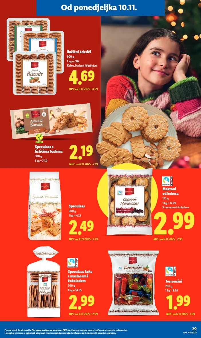 1.99 mpc na 6.11.2025.: 1.99 torroncini 200 g 1 kg = 9.95 2.99 mpc na 6.11.2025.: 2.99 speculaas keks s maslacem i čokoladom 200 g 1 kg = 14.95 2.19 mpc na 6.11.2025.: 2.19 speculaas s listićima badema 300 g 1 kg = 7.30 2.49 mpc na 13.9.2025.: 2.49 speculaas 600 g 1 kg = 4.15 4.69 mpc na 6.11.2025.: 4.69 božićni keksići 600 g 1 kg = 7.82 kokos, bademi ili lješnjaci makroni od kokosa 175 g 1 kg = 17.09 s tamnom čokoladom 2.99 mpc na 6.11.2025.: 2.99 29 nac 46/2025 ponuda vrijedi do isteka zaliha. sve cijene izražene su u eurima s pdv-om. kupnja je moguća samo u količinama primjerenim za kućanstvo. fotografije ne moraju u potpunosti odgovarati stvarnom izgledu proizvoda. ispričavamo se zbog mogućih tiskarskih pogrešaka. od ponedjeljka 10.11.