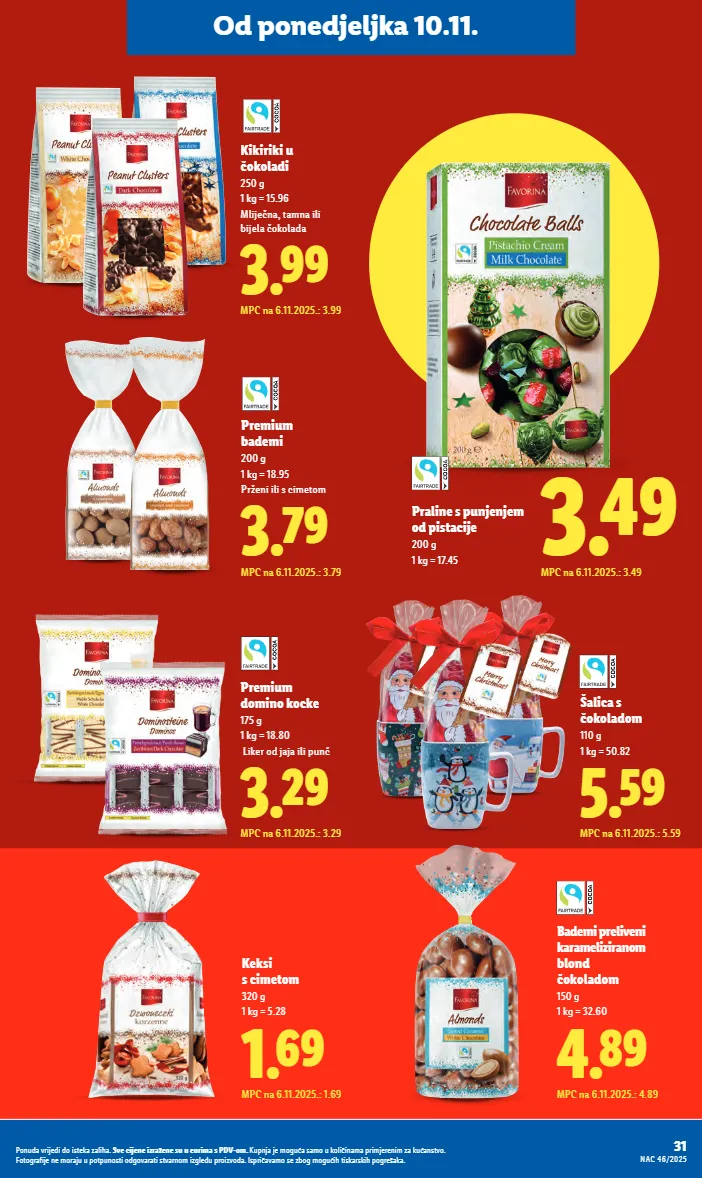 3.79 mpc na 6.11.2025.: 3.79 premium bademi 200 g 1 kg = 18.95 prženi ili s cimetom 3.99 mpc na 6.11.2025.: 3.99 kikiriki u čokoladi 250 g 1 kg = 15.96 mliječna, tamna ili bijela čokolada 5.59 mpc na 6.11.2025.: 5.59 šalica s čokoladom 110 g 1 kg = 50.82 1.69 mpc na 6.11.2025.: 1.69 keksi s cimetom 320 g 1 kg = 5.28 3.49 mpc na 6.11.2025.: 3.49 praline s punjenjem od pistacije 200 g 1 kg = 17.45 3.29 mpc na 6.11.2025.: 3.29 premium domino kocke 175 g 1 kg = 18.80 liker od jaja ili punč 4.89 mpc na 6.11.2025.: 4.89 bademi preliveni karameliziranom blond čokoladom 150 g 1 kg = 32.60 31 nac 46/2025 ponuda vrijedi do isteka zaliha. sve cijene izražene su u eurima s pdv-om. kupnja je moguća samo u količinama primjerenim za kućanstvo. fotografije ne moraju u potpunosti odgovarati stvarnom izgledu proizvoda. ispričavamo se zbog mogućih tiskarskih pogrešaka. od ponedjeljka 10.11.