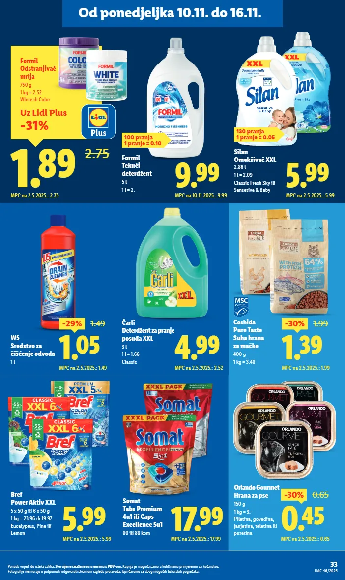 17.99 mpc na 2.5.2025.: 17.99 somat tabs premium 4u1 ili caps excellence 5u1 80 ili 88 kom 5.99 mpc na 2.5.2025.: 5.99 silan omekšivač xxl 2.86 l 1 l = 2.09 classic fresh sky ili sensetive & baby 9.99 mpc na 10.11.2025.: 9.99 formil tekući deterdžent 5 l 1 l = 2.- w5 sredstvo za čišćenje odvoda 1 l 5.99 mpc na 2.5.2025.: 5.99 bref power aktiv xxl 5 x 50 g ili 6 x 50 g 1 kg = 23.96 ili 19.97 eucalyptus, pine ili lemon 1.39 -30% 1.99 mpc na 2.5.2025.: 1.99 coshida pure taste suha hrana za mačke 400 g 1 kg = 3.48 0.45 -30% 0.65 mpc na 2.5.2025.: 0.65 orlando gourmet hrana za pse 150 g 1 kg = 3.- piletina, govedina, janjetina, teletina ili puretina uz lidl plus -31% 1.89 2.75 formil odstranjivač mrlja 750 g 1 kg = 2.52 white ili color mpc na 2.5.2025.: 2.75 100 pranja 1 pranje = 0.10 1.05 -29% 1.49 mpc na 2.5.2025.: 1.49 4.99 mpc na 2.5.2025.: 2.52 čarli deterdžent za pranje posuđa xxl 3 l 1 l = 1.66 classic 130 pranja 1 pranje = 0.05 33 nac 46/2025 ponuda vrijedi do isteka zaliha. sve cijene izražene su u eurima s pdv-om. kupnja je moguća samo u količinama primjerenim za kućanstvo. fotografije ne moraju u potpunosti odgovarati stvarnom izgledu proizvoda. ispričavamo se zbog mogućih tiskarskih pogrešaka. od ponedjeljka 10.11. do 16.11.