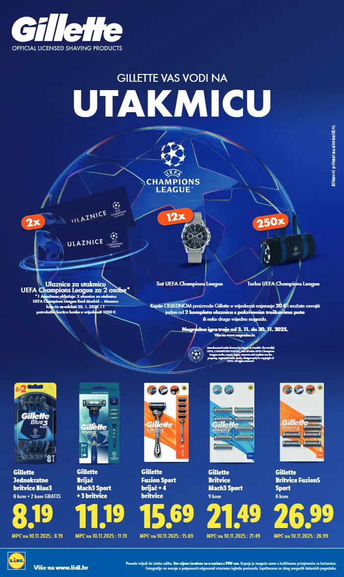 Ulaznice za utakmicu UEFA Champions League za 2 osobe* *1 Aranžman uključuje: 2 ulaznice za utakmicu UEFA Champions League Real Madrid – Monaco koja će se održati 20. 1. 2026. i 1 potrošačku karticu banke u vrijednosti 1000 € 2x Torba UEFA Champions League 250x Sat UEFA Champions League 12x Slikovni prikazi su simbolični. Kupite ODJEDNOM proizvode Gillette u vrijednosti najmanje 20 € i možete osvojiti jedan od 2 kompleta ulaznica s pokrivenim troškovima puta ili neku drugu vrijednu nagradu. Nagradna igra traje od 3. 11. do 30. 11. 2025. Više na www.nagradne.hr. GILLETTE VAS VODI NA UTAKMICU 8.19 MPC na 10.11.2025.: 8.19 Gillette Jednokratne britvice Blue3 6 kom + 2 kom GRATIS 26.99 MPC na 10.11.2025.: 26.99 Gillette Britvice Fusion5 Sport 6 kom 21.49 MPC na 10.11.2025.: 21.49 Gillette Britvice Mach3 Sport 9 kom 11.19 MPC na 10.11.2025.: 11.19 Gillette Brijač Mach3 Sport + 3 britvice Manufactured under licence by Procter & Gamble. The word(s) UEFA, CHAMPIONS LEAGUE, and all other UEFA Champions League marks, names, logos, mascots and trophies are the property, registered trade marks, designs and/or copyright of UEFA. All rights reserved. 15.69 MPC na 10.11.2025.: 15.69 Gillette Fusion Sport brijač + 4 britvice Ponuda vrijedi do isteka zaliha. Sve cijene izražene su u eurima s PDV-om. Kupnja je moguća samo u količinama primjerenim za kućanstvo. Fotografije ne moraju u potpunosti odgovarati stvarnom izgledu proizvoda. Ispričavamo se zbog mogućih tiskarskih pogrešaka. Više na www.lidl.hr