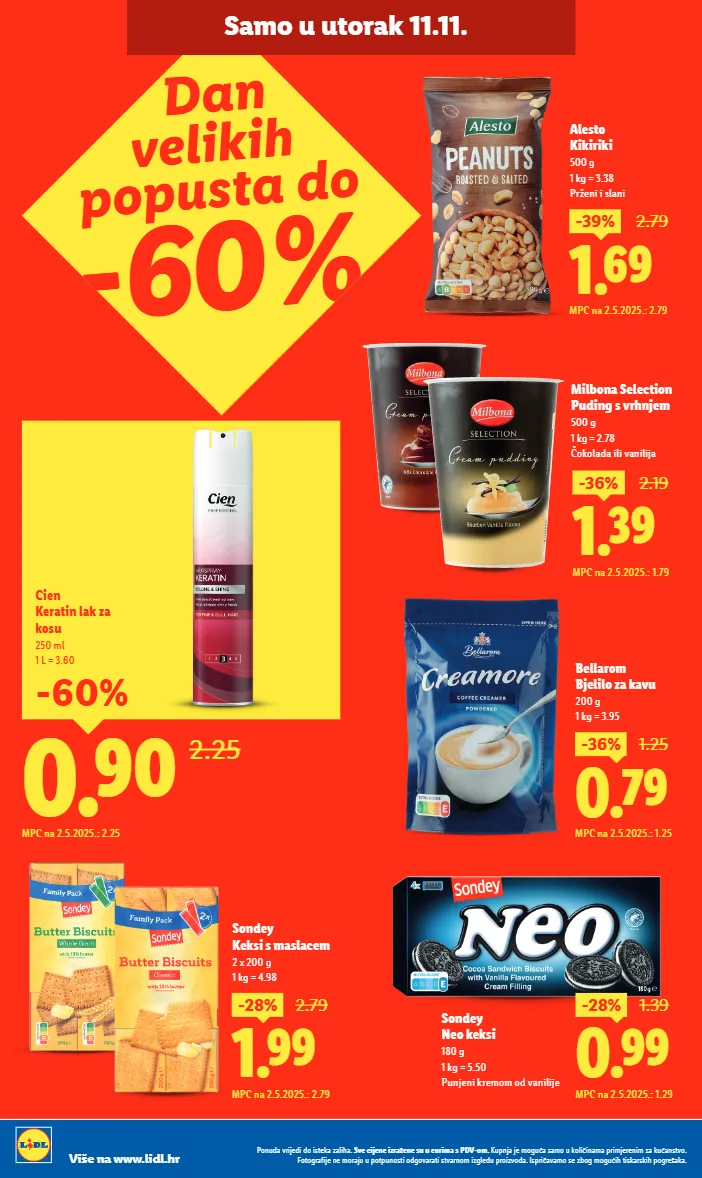 do -xx% na odabrane proizvode super ponuda! od četvrtka 0.99 -28% 1.39 mpc na 2.5.2025.: 1.29 sondey neo keksi 180 g 1 kg = 5.50 punjeni kremom od vanilije 1.99 -28% 2.79 mpc na 2.5.2025.: 2.79 sondey keksi s maslacem 2 x 200 g 1 kg = 4.98 0.90 2.25 mpc na 2.5.2025.: 2.25 -60% cien keratin lak za kosu 250 ml 1 l = 3.60 0.79 -36% 1.25 mpc na 2.5.2025.: 1.25 bellarom bjelilo za kavu 200 g 1 kg = 3.95 1.69 -39% 2.79 mpc na 2.5.2025.: 2.79 alesto kikiriki 500 g 1 kg = 3.38 prženi i slani milbona selection puding s vrhnjem 500 g 1 kg = 2.78 čokolada ili vanilija 1.39 -36% 2.19 mpc na 2.5.2025.: 1.79 ponuda vrijedi do isteka zaliha. sve cijene izražene su u eurima s pdv-om. kupnja je moguća samo u količinama primjerenim za kućanstvo. fotografije ne moraju u potpunosti odgovarati stvarnom izgledu proizvoda. ispričavamo se zbog mogućih tiskarskih pogrešaka. više na www.lidl.hr -60% dan velikih popusta do samo u utorak 11.11.