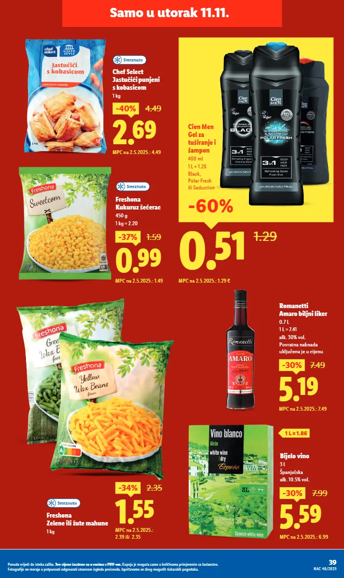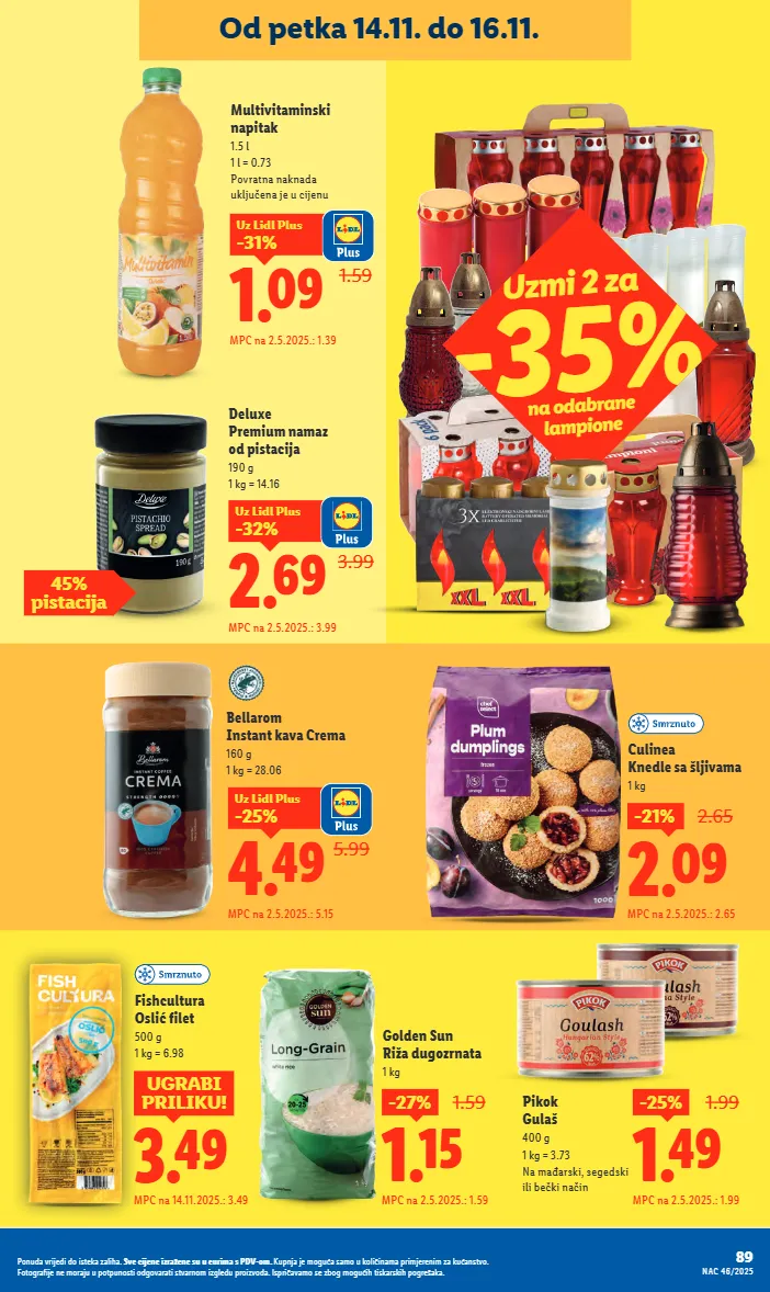 1.49 -25% 1.99 mpc na 2.5.2025.: 1.99 pikok gulaš 400 g 1 kg = 3.73 na mađarski, segedski ili bečki način 1.15 -27% 1.59 mpc na 2.5.2025.: 1.59 golden sun riža dugozrnata 1 kg 3.99 2.69 -32% uz lidl plus mpc na 2.5.2025.: 3.99 45% pistacija deluxe premium namaz od pistacija 190 g 1 kg = 14.16 multivitaminski napitak 1.5 l 1 l = 0.73 povratna naknada uključena je u cijenu 2.09 -21% 2.65 mpc na 2.5.2025.: 2.65 culinea knedle sa šljivama 1 kg 1.59 1.09 -31% uz lidl plus mpc na 2.5.2025.: 1.39 5.99 4.49 -25% uz lidl plus mpc na 2.5.2025.: 5.15 bellarom instant kava crema 160 g 1 kg = 28.06 uzmi 2 za -35% na odabrane lampione 3.49 ugrabi priliku! mpc na 14.11.2025.: 3.49 fishcultura oslić filet 500 g 1 kg = 6.98 89 nac 46/2025 ponuda vrijedi do isteka zaliha. sve cijene izražene su u eurima s pdv-om. kupnja je moguća samo u količinama primjerenim za kućanstvo. fotografije ne moraju u potpunosti odgovarati stvarnom izgledu proizvoda. ispričavamo se zbog mogućih tiskarskih pogrešaka. od petka 14.11. do 16.11.