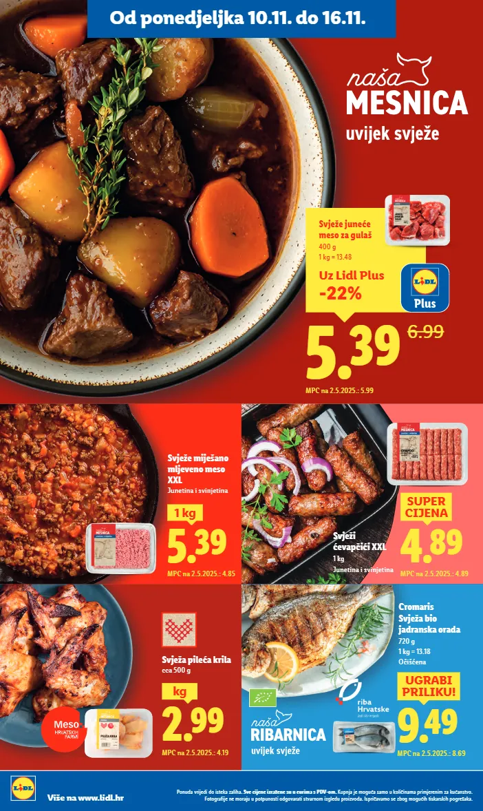 uz lidl plus -22% 5.39 6.99 svježe juneće meso za gulaš 400 g 1 kg = 13.48 mpc na 2.5.2025.: 5.99 cromaris svježa bio jadranska orada 720 g 1 kg = 13.18 očišćena 9.49 ugrabi priliku! mpc na 2.5.2025.: 8.69 svježa pileća krila cca 500 g 2.99 kg mpc na 2.5.2025.: 4.19 9071 4.89 super cijena mpc na 2.5.2025.: 4.89 svježi ćevapčići xxl 1 kg junetina i svinjetina 5.39 1 kg mpc na 2.5.2025.: 4.85 svježe miješano mljeveno meso xxl junetina i svinjetina ponuda vrijedi do isteka zaliha. sve cijene izražene su u eurima s pdv-om. kupnja je moguća samo u količinama primjerenim za kućanstvo. fotografije ne moraju u potpunosti odgovarati stvarnom izgledu proizvoda. ispričavamo se zbog mogućih tiskarskih pogrešaka. više na www.lidl.hr ponuda vrijedi do isteka zaliha. sve cijene izražene su u eurima s pdv-om. kupnja je moguća samo u količinama primjerenim za kućanstvo. fotografije ne moraju u potpunosti odgovarati stvarnom izgledu proizvoda. ispričavamo se zbog mogućih tiskarskih pogrešaka. više na www.lidl.hr od ponedjeljka 10.11. do 16.11.
