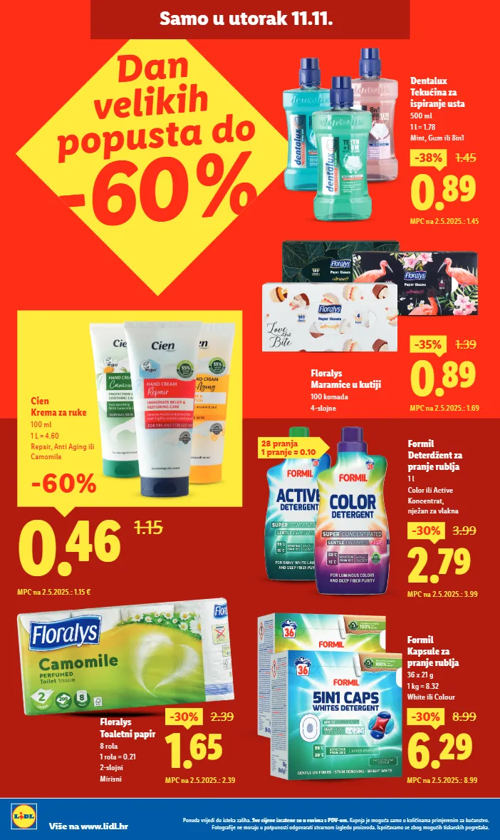 -60% dan velikih popusta do 2.79 -30% 3.99 mpc na 2.5.2025.: 3.99 formil deterdžent za pranje rublja 1 l color ili active koncentrat, nježan za vlakna 6.29 -30% 8.99 mpc na 2.5.2025.: 8.99 formil kapsule za pranje rublja 36 x 21 g 1 kg = 8.32 white ili colour 0.89 -38% 1.45 mpc na 2.5.2025.: 1.45 dentalux tekućina za ispiranje usta 500 ml 1 l = 1.78 mint, gum ili 8in1 floralys maramice u kutiji 100 komada 4-slojne 0.89 -35% 1.39 mpc na 2.5.2025.: 1.69 1.65 -30% 2.39 mpc na 2.5.2025.: 2.39 floralys toaletni papir 8 rola 1 rola = 0.21 2-slojni mirisni ponuda vrijedi do isteka zaliha. sve cijene izražene su u eurima s pdv-om. kupnja je moguća samo u količinama primjerenim za kućanstvo. fotografije ne moraju u potpunosti odgovarati stvarnom izgledu proizvoda. ispričavamo se zbog mogućih tiskarskih pogrešaka. više na www.lidl.hr 0.46 1.15 cien krema za ruke 100 ml 1 l = 4.60 repair, anti aging ili camomile mpc na 2.5.2025.: 1.15 € -60% 28 pranja 1 pranje = 0.10 samo u utorak 11.11.