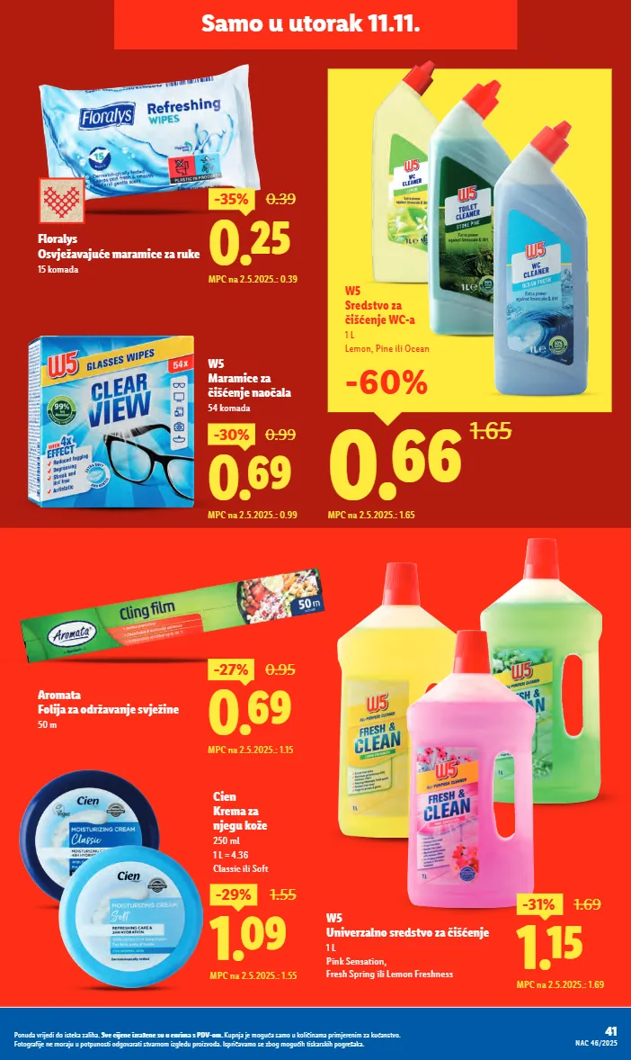 samo u utorak 11.11. 0.66 1.65 w5 sredstvo za čišćenje wc-a 1 l lemon, pine ili ocean mpc na 2.5.2025.: 1.65 -60% 0.69 -27% 0.95 mpc na 2.5.2025.: 1.15 aromata folija za održavanje svježine 50 m 1.09 -29% 1.55 mpc na 2.5.2025.: 1.55 cien krema za njegu kože 250 ml 1 l = 4.36 classic ili soft 1.15 -31% 1.69 mpc na 2.5.2025.: 1.69 w5 univerzalno sredstvo za čišćenje 1 l pink sensation, fresh spring ili lemon freshness 0.69 -30% 0.99 mpc na 2.5.2025.: 0.99 w5 maramice za čišćenje naočala 54 komada 0.25 -35% 0.39 mpc na 2.5.2025.: 0.39 floralys osvježavajuće maramice za ruke 15 komada 41 nac 46/2025 ponuda vrijedi do isteka zaliha. sve cijene izražene su u eurima s pdv-om. kupnja je moguća samo u količinama primjerenim za kućanstvo. fotografije ne moraju u potpunosti odgovarati stvarnom izgledu proizvoda. ispričavamo se zbog mogućih tiskarskih pogrešaka.