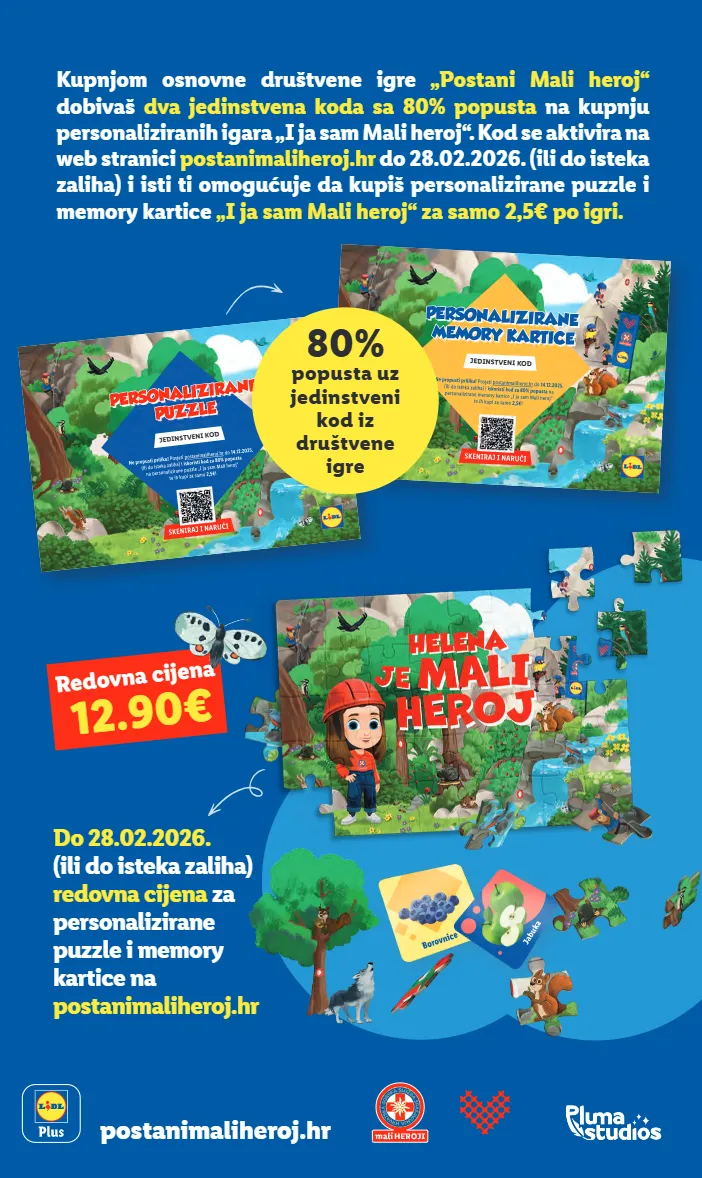 Kupnjom osnovne društvene igre „Postani Mali heroj“ dobivaš dva jedinstvena koda sa 80% popusta na kupnju personaliziranih igara „I ja sam Mali heroj“. Kod se aktivira na web stranici postanimaliheroj.hr do 28.02.2026. (ili do isteka zaliha) i isti ti omogućuje da kupiš personalizirane puzzle i memory kartice „I ja sam Mali heroj“ za samo 2,5€ po igri. 12.90€ Redovna cijena postanimaliheroj.hr JEDINSTVENI KOD JEDINSTVENI KOD 80% popusta uz jedinstveni kod iz društvene igre Do 28.02.2026. (ili do isteka zaliha) redovna cijena za personalizirane puzzle i memory kartice na postanimaliheroj.hr