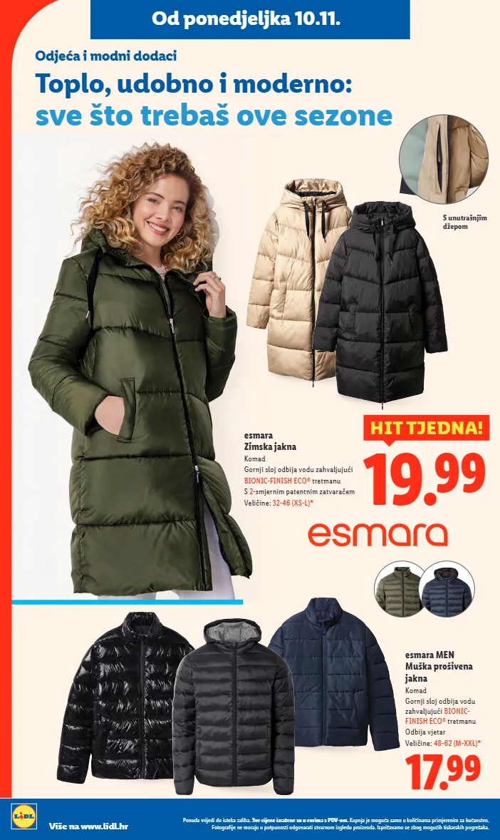 od ponedjeljka 10.11. toplo, udobno i moderno: sve što trebaš ove sezone odjeća i modni dodaci od ponedjeljka 10.11. esmara zimska jakna komad gornji sloj odbija vodu zahvaljujući bionic-finish eco® tretmanu s 2 -smjernim patentnim zatvaračem veličine: 32-46 (xs-l)* 19.99 hit tjedna! s unutrašnjim džepom 17.99 esmara men muška prošivena jakna komad gornji sloj odbija vodu zahvaljujući bionic- finish eco® tretmanu odbija vjetar veličine: 48-62 (m-xxl)* ponuda vrijedi do isteka zaliha. sve cijene izražene su u eurima s pdv-om. kupnja je moguća samo u količinama primjerenim za kućanstvo. fotografije ne moraju u potpunosti odgovarati stvarnom izgledu proizvoda. ispričavamo se zbog mogućih tiskarskih pogrešaka. više na www.lidl.hr