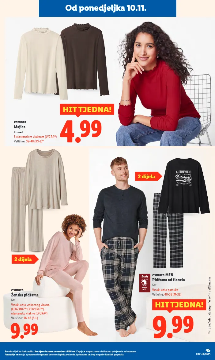 od ponedjeljka 10.11. esmara majica komad s elastanskim vlaknom (lycra®) veličine: 32-46 (xs-l)* 4.99 hit tjedna! esmara men pidžama od flanela set visoki udio pamuka veličine: 48-58 (m-xl) 9.99 hit tjedna! 2 dijela 9.99 esmara ženska pidžama set visoki udio viskoznog vlakna (lenzing™ ecovero™) i elastansko vlakno (lycra®) veličine: 36-46 (s-l) 2 dijela *modeli nisu dostupni u svim veličinama 45 nac 46/2025 ponuda vrijedi do isteka zaliha. sve cijene izražene su u eurima s pdv-om. kupnja je moguća samo u količinama primjerenim za kućanstvo. fotografije ne moraju u potpunosti odgovarati stvarnom izgledu proizvoda. ispričavamo se zbog mogućih tiskarskih pogrešaka.