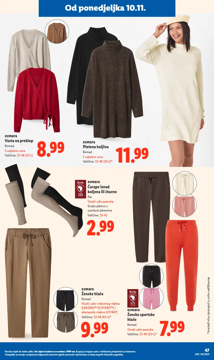 odjeća i modni dodaci od ponedjeljka 10.11. 9.99 esmara pulover komad s udjelom vune veličine: 32-46 (xs-l)* 9.99 esmara hlače komad u izgledu kože s elastanskim vlaknom (lycra®) veličine: 34-46* 21.99 esmara ženske kožne čizme par ugodne za nošenje zahvaljujući mekanoj i toploj podstavi od tekstila tpr potplat veličine: 37-41* ponuda vrijedi do isteka zaliha. sve cijene izražene su u eurima s pdv-om. kupnja je moguća samo u količinama primjerenim za kućanstvo. fotografije ne moraju u potpunosti odgovarati stvarnom izgledu proizvoda. ispričavamo se zbog mogućih tiskarskih pogrešaka. više na www.lidl.hr