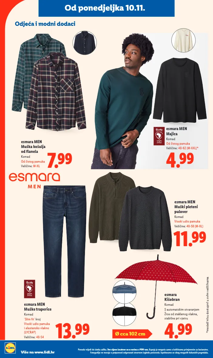 od ponedjeljka 10.11. odjeća i modni dodaci 4.99 esmara men majica komad od čistog pamuka veličine: 48-62 (m-xxl)* 13.99 esmara men muške traperice komad 'slim fit' kroj visoki udio pamuka i elastansko vlakno (lycra®) veličine: 48-54 11.99 esmara men muški pleteni pulover komad visoki udio pamuka veličine: 48-58 (m-xl) 7.99 esmara men muška košulja od flanela komad od čistog pamuka veličine: m-xl *modeli nisu dostupni u svim veličinama esmara kišobran komad s automatskim otvaranjem žice od staklenog vlakna, stabilne pri vjetru 4.99 ø cca 102 cm ponuda vrijedi do isteka zaliha. sve cijene izražene su u eurima s pdv-om. kupnja je moguća samo u količinama primjerenim za kućanstvo. fotografije ne moraju u potpunosti odgovarati stvarnom izgledu proizvoda. ispričavamo se zbog mogućih tiskarskih pogrešaka. više na www.lidl.hr