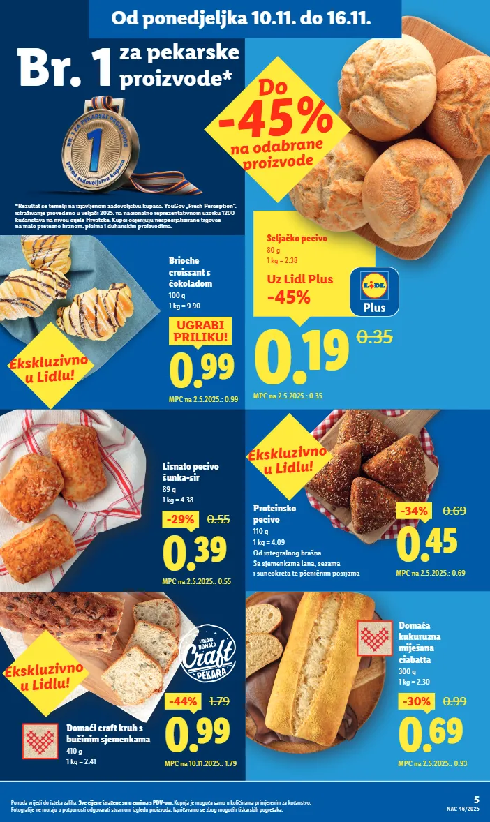 *rezultat se temelji na izjavljenom zadovoljstvu kupaca. yougov „fresh perception”. istraživanje provedeno u veljači 2025. na nacionalno reprezentativnom uzorku 1200 kućanstava na nivou cijele hrvatske. kupci ocjenjuju nespecijalizirane trgovce na malo pretežno hranom. pićima i duhanskim proizvodima. br. 1 za pekarske proizvode* uz lidl plus -45% 0.19 0.35 seljačko pecivo 80 g 1 kg = 2.38 mpc na 2.5.2025.: 0.35 0.45 -34% 0.69 mpc na 2.5.2025.: 0.69 proteinsko pecivo 110 g 1 kg = 4.09 od integralnog brašna sa sjemenkama lana, sezama i suncokreta te pšeničnim posijama ekskluzivno u lidlu! ekskluzivno u lidlu! brioche croissant s čokoladom 100 g 1 kg = 9.90 0.99 ugrabi priliku! mpc na 2.5.2025.: 0.99 0.99 -44% 1.79 mpc na 10.11.2025.: 1.79 domaći craft kruh s bučinim sjemenkama 410 g 1 kg = 2.41 0.69 -30% 0.99 mpc na 2.5.2025.: 0.93 domaća kukuruzna miješana ciabatta 300 g 1 kg = 2.30 do -45% na odabrane proizvode ekskluzivno u lidlu! 0.39 -29% 0.55 mpc na 2.5.2025.: 0.55 lisnato pecivo šunka-sir 89 g 1 kg = 4.38 5 nac 38/2025 5 nac 46/2025 ponuda vrijedi do isteka zaliha. sve cijene izražene su u eurima s pdv-om. kupnja je moguća samo u količinama primjerenim za kućanstvo. fotografije ne moraju u potpunosti odgovarati stvarnom izgledu proizvoda. ispričavamo se zbog mogućih tiskarskih pogrešaka. od ponedjeljka 10.11. do 16.11.