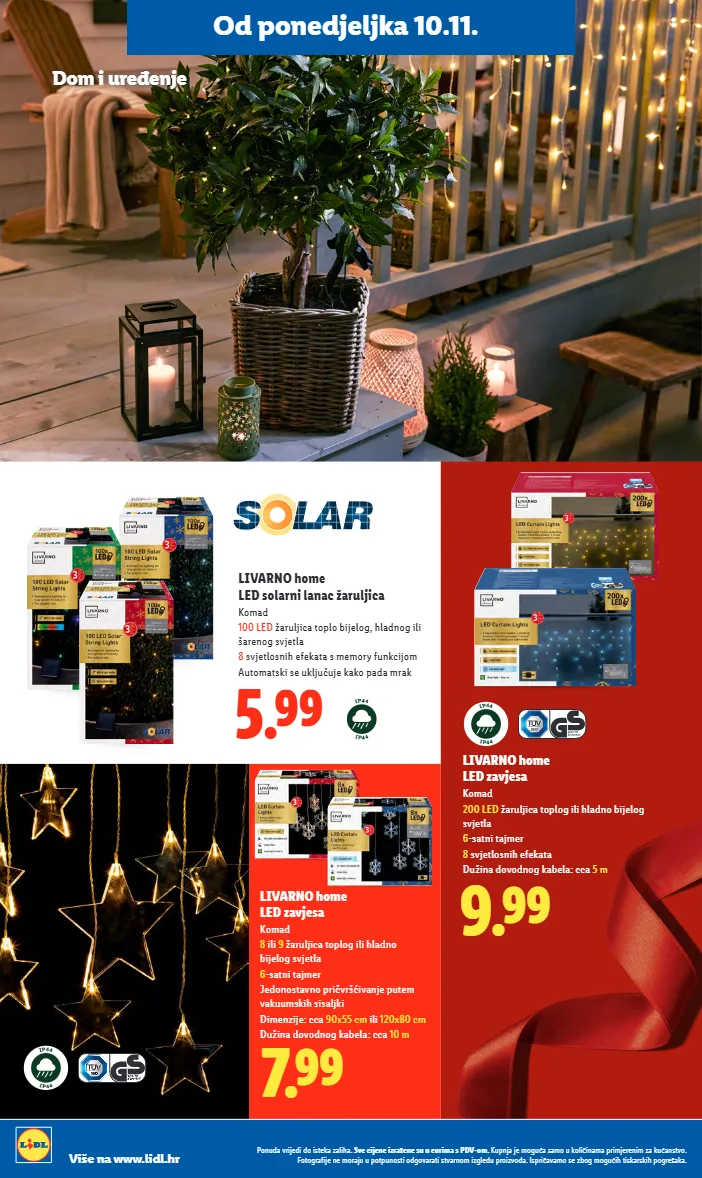 9.99 livarno home led zavjesa komad 200 led žaruljica toplog ili hladno bijelog svjetla 6 -satni tajmer 8 svjetlosnih efekata dužina dovodnog kabela: cca 5 m od ponedjeljka 10.11. 5.99 livarno home led solarni lanac žaruljica komad 100 led žaruljica toplo bijelog, hladnog ili šarenog svjetla 8 svjetlosnih efekata s memory funkcijom automatski se uključuje kako pada mrak 7.99 livarno home led zavjesa komad 8 ili 9 žaruljica toplog ili hladno bijelog svjetla 6 -satni tajmer jedonostavno pričvršćivanje putem vakuumskih sisaljki dimenzije: cca 90x55 cm ili 120x80 cm dužina dovodnog kabela: cca 10 m i p 4 4 i p 4 4 i p 4 4 i p 4 4 i p 4 4 i p 4 4 dom i uređenje ponuda vrijedi do isteka zaliha. sve cijene izražene su u eurima s pdv-om. kupnja je moguća samo u količinama primjerenim za kućanstvo. fotografije ne moraju u potpunosti odgovarati stvarnom izgledu proizvoda. ispričavamo se zbog mogućih tiskarskih pogrešaka. više na www.lidl.hr
