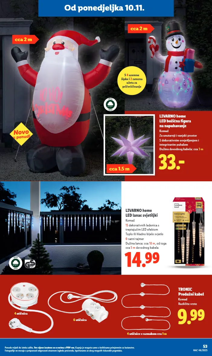 9.99 tronic produžni kabel komad različite vrste 33.- livarno home led božićna figura na napuhavanje komad za unutarnji i vanjski prostor s dekorativnim osvjetljenjem i integriranim puhalom dužina dovodnog kabela: cca 3 m od ponedjeljka 10.11. 14.99 livarno home led lanac svjetiljki komad 15 dekorativnih ledenica s treptajućim led efektom toplo ili hladno bijelo svjetlo 6 -satni tajmer dužina lanca: cca 18 m , od toga cca 5 m dovodnog kabela i p 4 4 i p 4 4 i p 4 4 i p 4 4 cca 2 m cca 2 m cca 1.5 m s 4 uzemne šipke i 2 zatezna užeta za pričvršćivanje novo u ponudi 6 utičnica 4 utičnica 4 utičnice s razmakom cca 1 m 53 nac 46/2025 ponuda vrijedi do isteka zaliha. sve cijene izražene su u eurima s pdv-om. kupnja je moguća samo u količinama primjerenim za kućanstvo. fotografije ne moraju u potpunosti odgovarati stvarnom izgledu proizvoda. ispričavamo se zbog mogućih tiskarskih pogrešaka.
