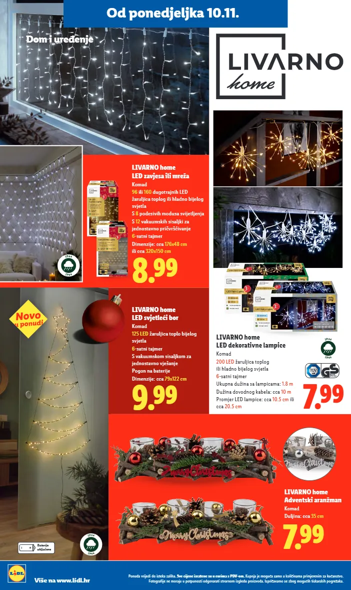 i p 4 4 i p 4 4 od ponedjeljka 10.11. 7.99 livarno home led dekorativne lampice komad 200 led žaruljica toplog ili hladno bijelog svjetla 6 -satni tajmer ukupna dužina sa lampicama: 1.8 m dužina dovodnog kabela: cca 10 m promjer led lampice: cca 10.5 cm ili cca 20.5 cm 9.99 livarno home led svjetleći bor komad 125 led žaruljica toplo bijelog svjetla 6 -satni tajmer s vakuumskom sisaljkom za jednostavno vješanje pogon na baterije dimenzije: cca 79x122 cm 7.99 livarno home adventski aranžman komad duljina: cca 35 cm 8.99 livarno home led zavjesa ili mreža komad 96 ili 160 dugotrajnih led žaruljica toplog ili hladno bijelog svjetla s 8 podesivih modusa svijetljenja s 12 vakuumskih sisaljki za jednostavno pričvršćivanje 6 -satni tajmer dimenzije: cca 176x48 cm ili cca 320x150 cm i p 4 4 i p 4 4 i p 4 4 i p 4 4 novo u ponudi baterije uključene dom i uređenje ponuda vrijedi do isteka zaliha. sve cijene izražene su u eurima s pdv-om. kupnja je moguća samo u količinama primjerenim za kućanstvo. fotografije ne moraju u potpunosti odgovarati stvarnom izgledu proizvoda. ispričavamo se zbog mogućih tiskarskih pogrešaka. više na www.lidl.hr
