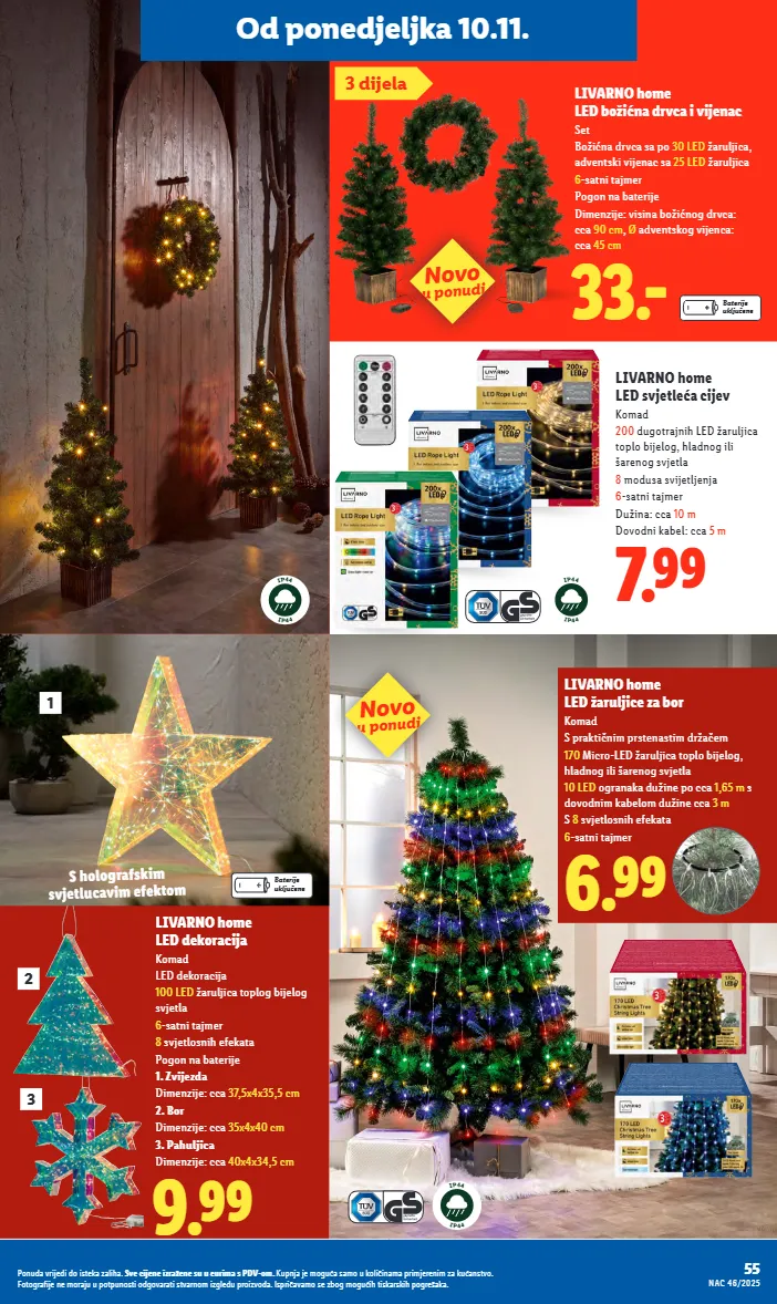 od ponedjeljka 10.11. 9.99 livarno home led dekoracija komad led dekoracija 100 led žaruljica toplog bijelog svjetla 6 -satni tajmer 8 svjetlosnih efekata pogon na baterije 1. zvijezda dimenzije: cca 37,5x4x35,5 cm 2. bor dimenzije: cca 35x4x40 cm 3. pahuljica dimenzije: cca 40x4x34,5 cm s holografskim svjetlucavim efektom 1 baterije uključene 2 3 7.99 livarno home led svjetleća cijev komad 200 dugotrajnih led žaruljica toplo bijelog, hladnog ili šarenog svjetla 8 modusa svijetljenja 6 -satni tajmer dužina: cca 10 m dovodni kabel: cca 5 m 6.99 livarno home led žaruljice za bor komad s praktičnim prstenastim držačem 170 micro-led žaruljica toplo bijelog, hladnog ili šarenog svjetla 10 led ogranaka dužine po cca 1,65 m s dovodnim kabelom dužine cca 3 m s 8 svjetlosnih efekata 6 -satni tajmer i p 4 4 i p 4 4 i p 4 4 i p 4 4 i p 4 4 i p 4 4 baterije uključene novo u ponudi 33.- livarno home led božićna drvca i vijenac set božićna drvca sa po 30 led žaruljica, adventski vijenac sa 25 led žaruljica 6 -satni tajmer pogon na baterije dimenzije: visina božićnog drvca: cca 90 cm , ø adventskog vijenca: cca 45 cm 3 dijela novo u ponudi 55 nac 46/2025 ponuda vrijedi do isteka zaliha. sve cijene izražene su u eurima s pdv-om. kupnja je moguća samo u količinama primjerenim za kućanstvo. fotografije ne moraju u potpunosti odgovarati stvarnom izgledu proizvoda. ispričavamo se zbog mogućih tiskarskih pogrešaka.