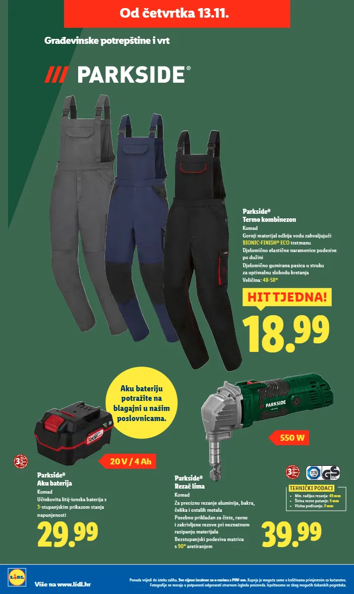 građevinske potrepštine i vrt parkside® termo kombinezon komad gornji materijal odbija vodu zahvaljujući bionic-finish® eco tretmanu djelomično elastične naramenice podesive po dužini djelomično gumirana pasica u struku za optimalnu slobodu kretanja veličina: 48-58* 18.99 hit tjedna! 39.99 parkside® rezač lima komad za precizno rezanje aluminija, bakra, čelika i ostalih metala posebno prikladan za čiste, ravne i zakrivljene rezove pri neznatnom rasipanju materijala bezstupanjski podesiva matrica s 90° aretiranjem tehnički podaci • min. radijus rezanja: 45 mm • širina rezne putanje: 5 mm • visina podizanja: 7 mm 550 w od četvrtka 13.11. 29.99 parkside® aku baterija komad učinkovita litij-ionska baterija s 3 -stupanjskim prikazom stanja napunjenosti 20 v / 4 ah aku bateriju potražite na blagajni u našim poslovnicama. ponuda vrijedi do isteka zaliha. sve cijene izražene su u eurima s pdv-om. kupnja je moguća samo u količinama primjerenim za kućanstvo. fotografije ne moraju u potpunosti odgovarati stvarnom izgledu proizvoda. ispričavamo se zbog mogućih tiskarskih pogrešaka. više na www.lidl.hr
